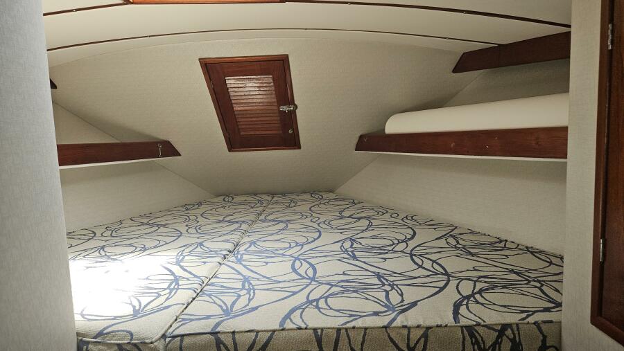 - Forward cabin: This cabin has a V-berth with fans, LED lighting, HVAC controls and vent with storage drawers underneath and a hanging locker.