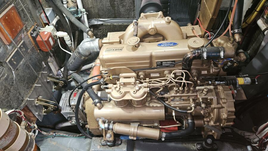 New old stock 1990 Ford Nor'East 90 HP diesel engine with self lubricating fuel injection pump. First commissioned in 2023. Pickled and held by Great Lakes dealer. New Hurth transmission.
