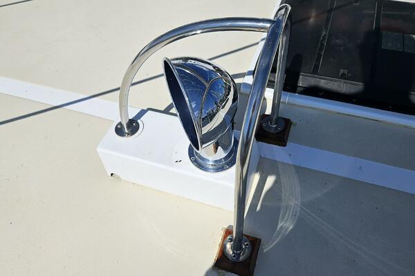 Custom 916 Stainless Steel rails; bow, stern and mast pulpits; davit, radar, solar arch and integrated swim platform with ladders from below waterline to swim platform and from swim platform to deck; dorades and stern towing bollards.