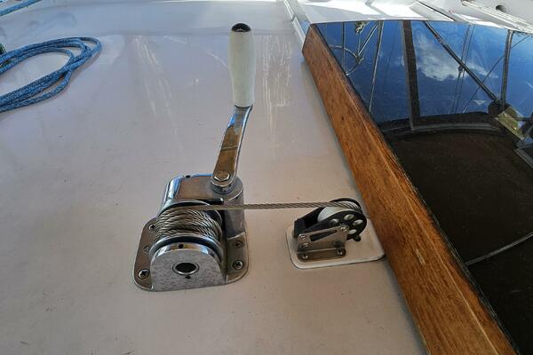 Rebuilt rudder (skinned, rebuilt, barrier coated, painted) and new cutlass bearing and dripless packing seals. Centerboard rebuilt and new pendant, cable, and winch.