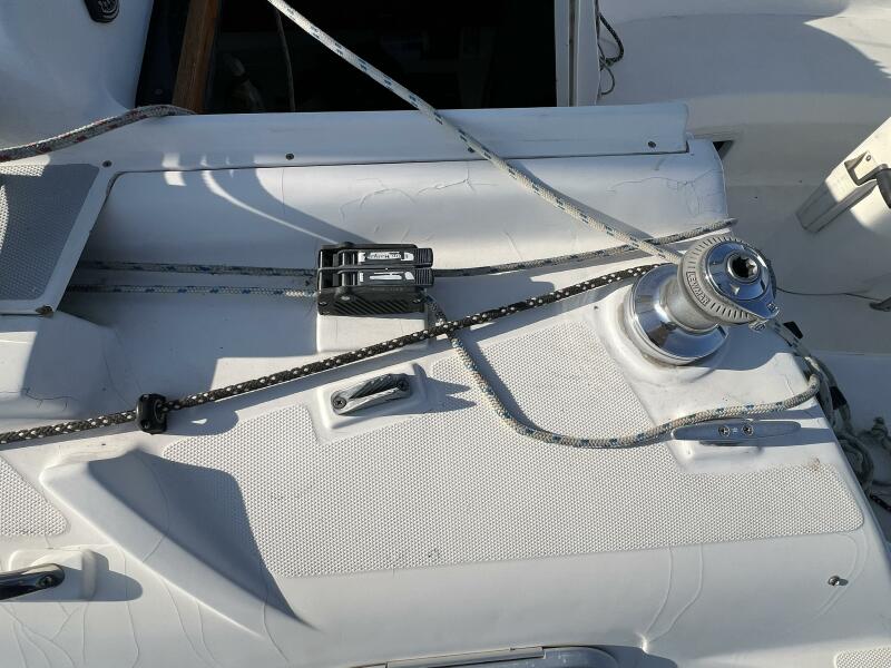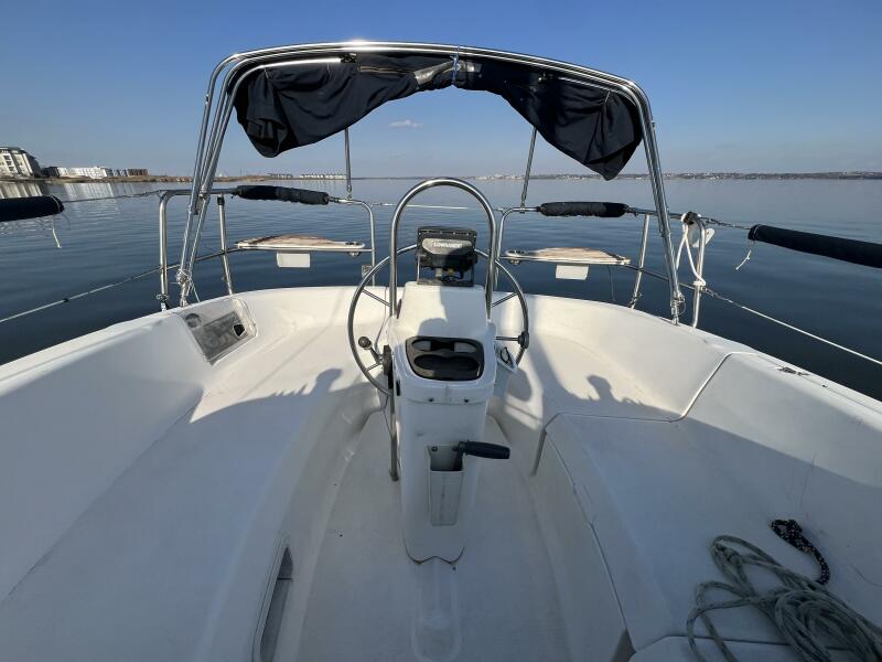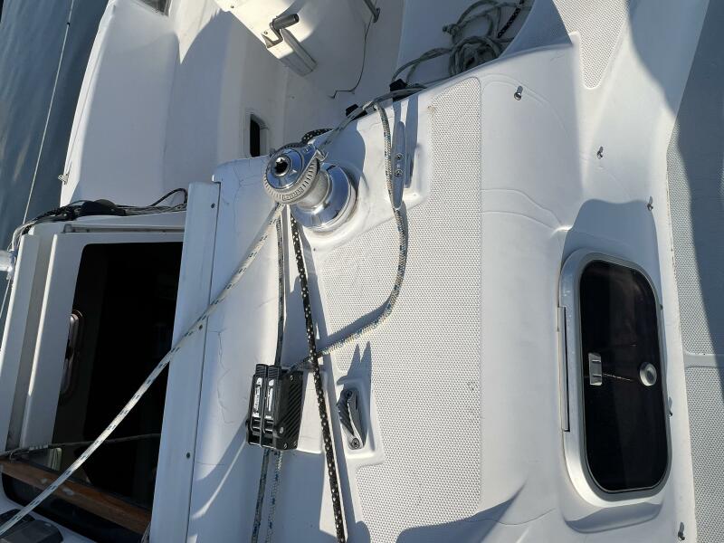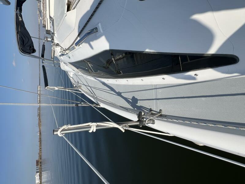 The cockpit is spacious and well laid out, offering comfortable seating and excellent visibility for the helm. Deck hardware is positioned for safe movement forward and easy sail handling.