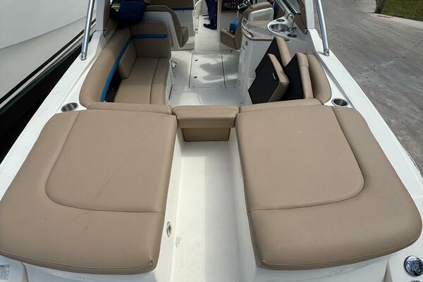 At 27 feet, the 270 SLX offers a spacious layout designed for comfort and convenience. The bow seating area features integrated armrests for lounging, while the cockpit entertainment center includes a Corian countertop and space for an optional 12V refrigerator. A finished fiberglass floor with snap-in carpet ensures easy cleanup after a day on the water. The gull wing sun pads come with an integrated filler cushion for additional lounging space.