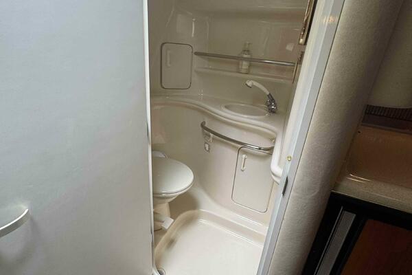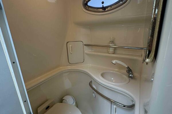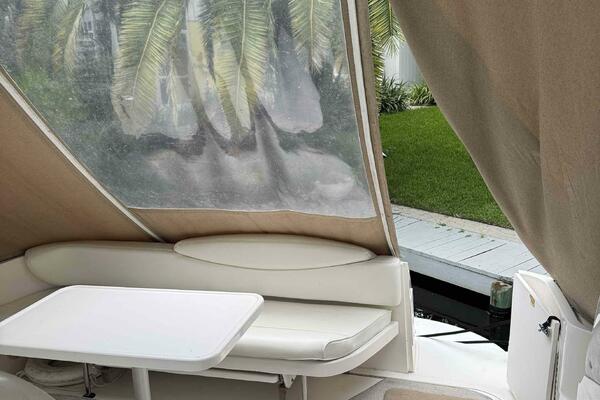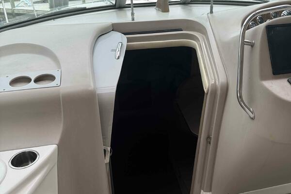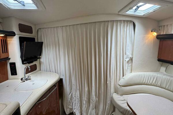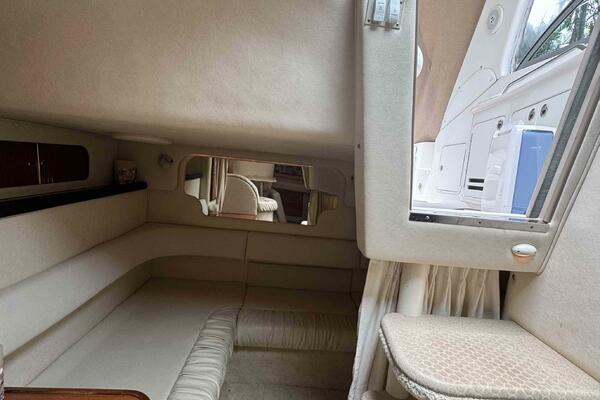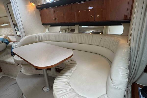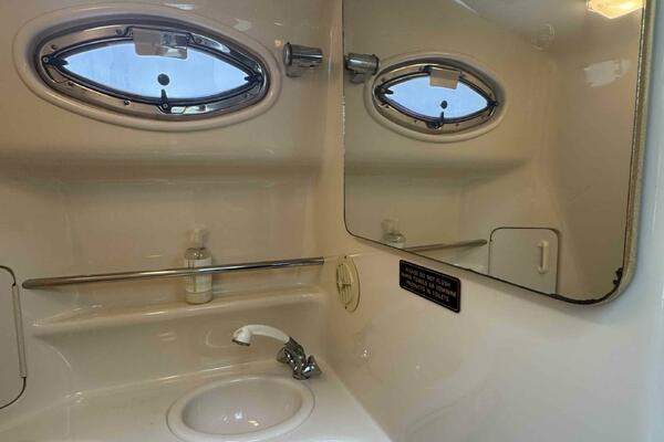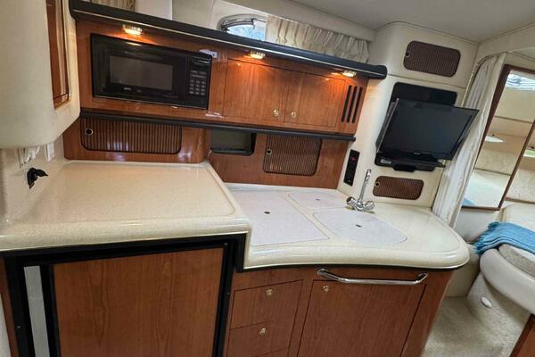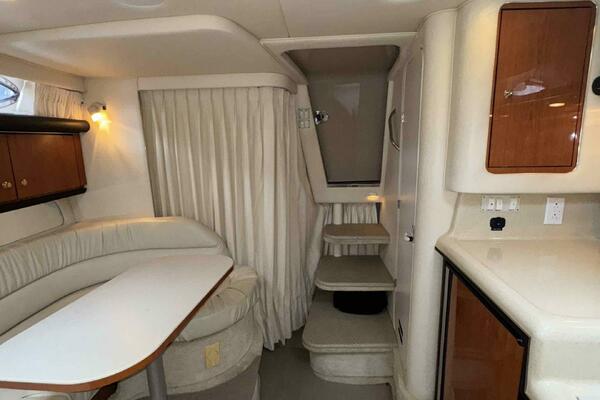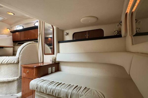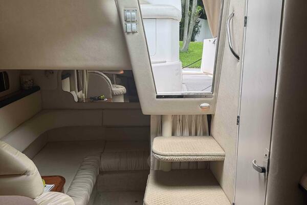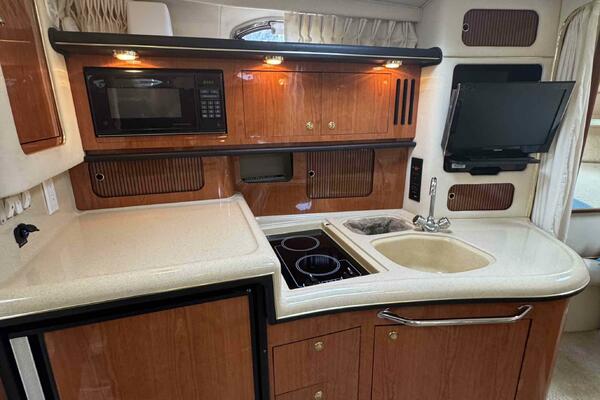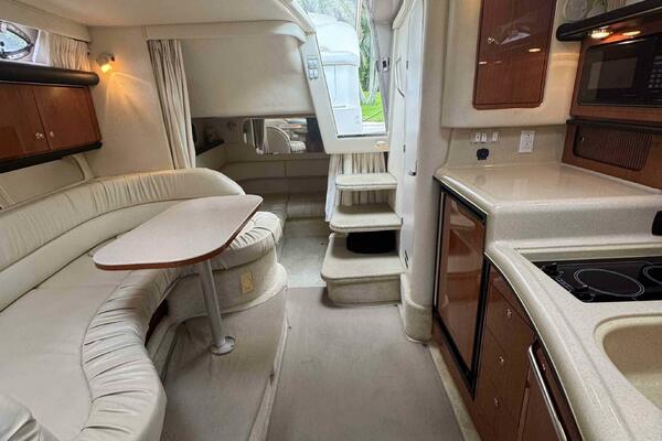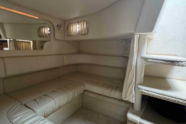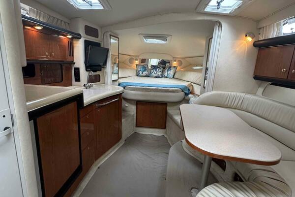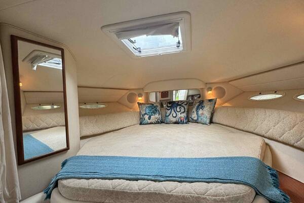 This Sundancer features a large cockpit and well-appointed cabin. The forward stateroom has a full sized berth with plenty of storage. The aft stateroom features Sea Ray's design, in which the conversation pit converts to a private double aft birth. The galley has all the comforts of home with3.4 cubic foot refrigerator, flush mount two burner stove, and countertop with sink and covers to create more counterspace and plenty of headroom throughout.