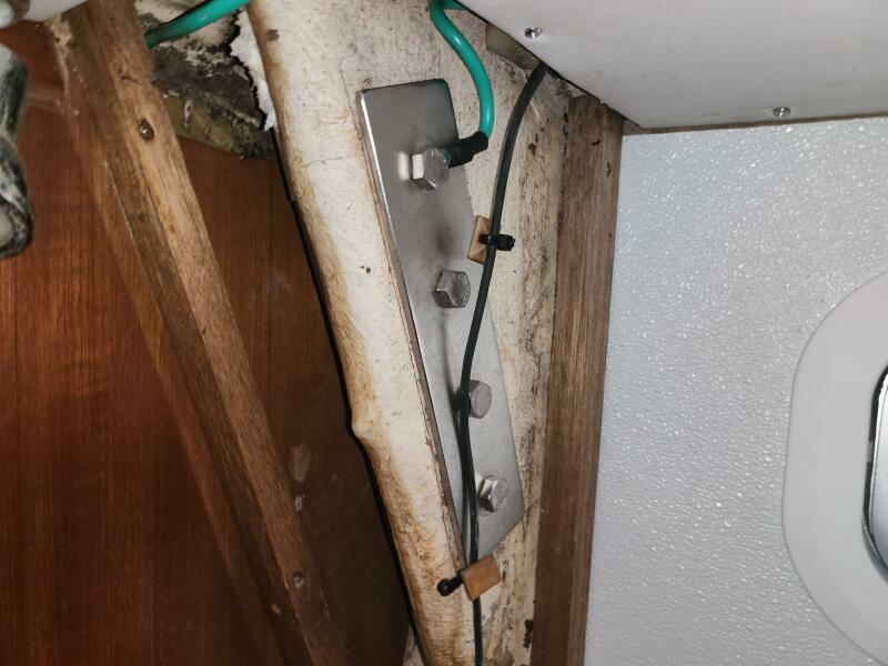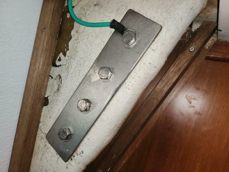 Due to clogged scuppers, rainwater overflowed from the cockpit down the companionway and soaked engine room insulation. The affected wood is non-structural and has been removed.