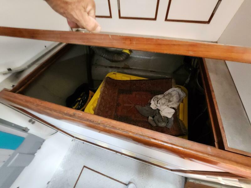 Cabinets: Ample storage around galley, Trash cabinet door missing