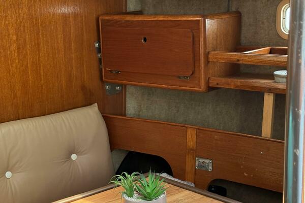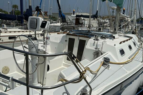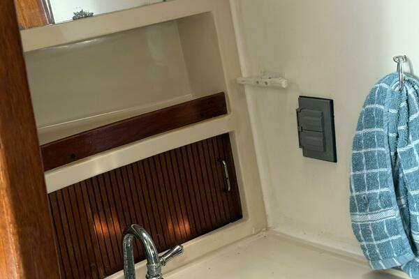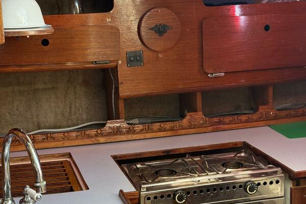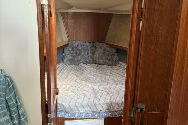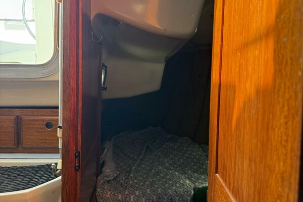 The bright, airy cabin boasts 6’4” headroom and generous accommodations for 5–6. The open salon features a U-shaped dinette, full galley with propane stove/oven, top-loading icebox, and plenty of storage. A private forward V-berth and spacious aft stateroom provide true cruising comfort.