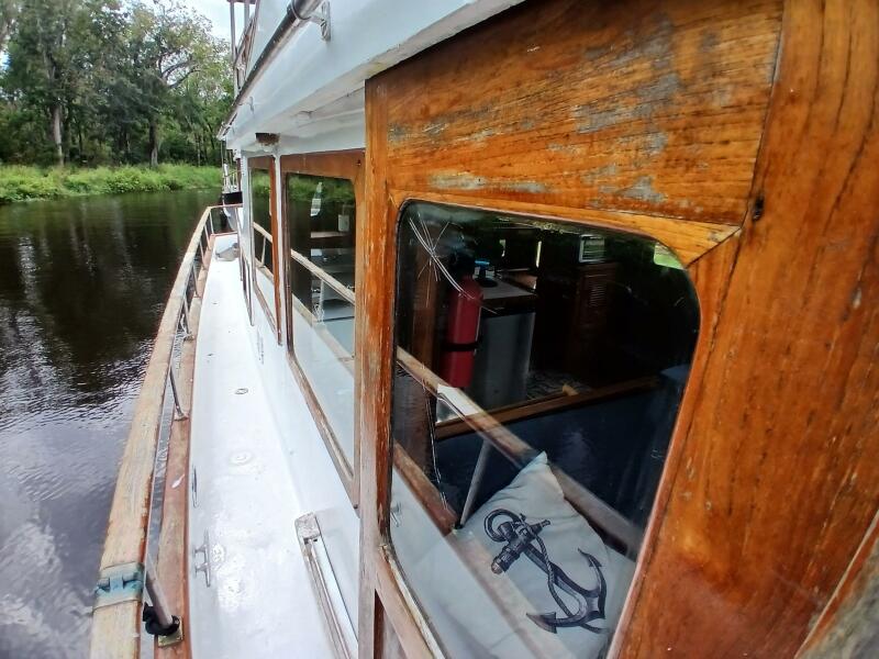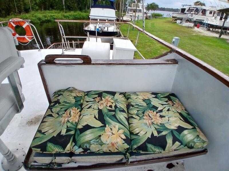 The exterior features a spacious top deck with multiple seating options and a full helm station as well. The side decks are wide and accommodating, with Teak guard rails for safety and style. This teak is in overall good condition but needs some varnish!