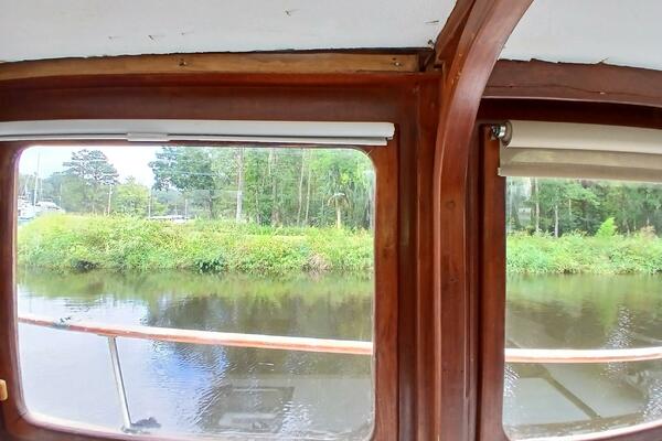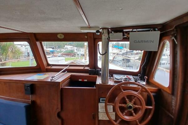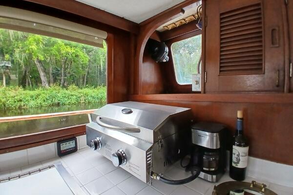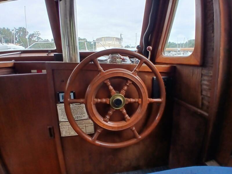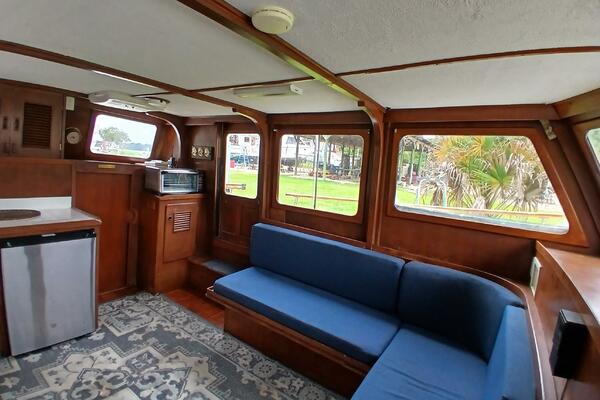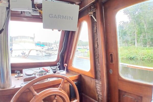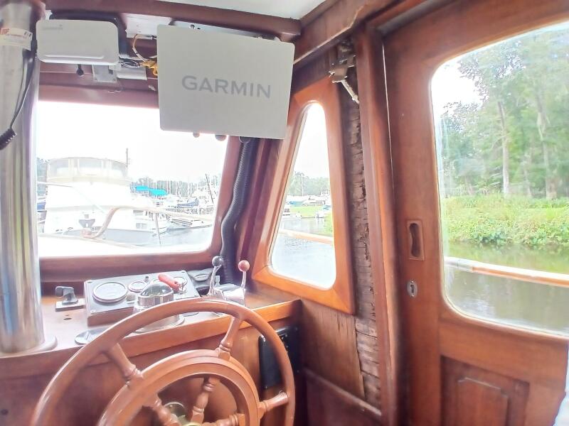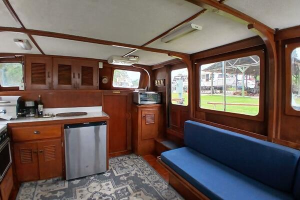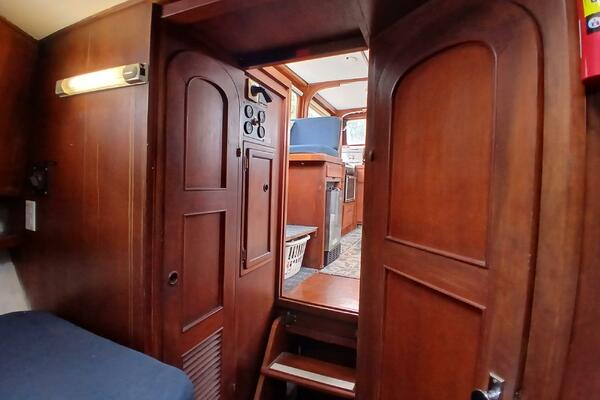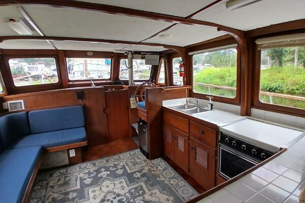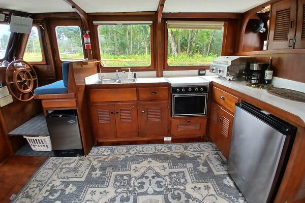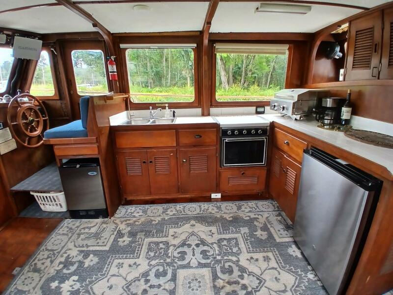 Marine Trader Trawlers have been loved in the cruising trawler community ever since they first came to the market. Their luxuriously spacious interiors are beautifully designed, with aesthetics and comfort in mind. Marrilee, a 1979 40 ft Double Cabin, is a fine example of this, with an incredible amount of space and storage. Her main cabin serves as a pilot house, galley, and salon. The spacious wood interior is calming and warm, with many large windows to let in the light. A comfortable settee is to port, and the galley on the starboard side has it all, storage, counter space, and a brand-new stainless-steel convection/microwave oven. Forward of the galley, the interior helm station has many upgraded features and incredible visibility.