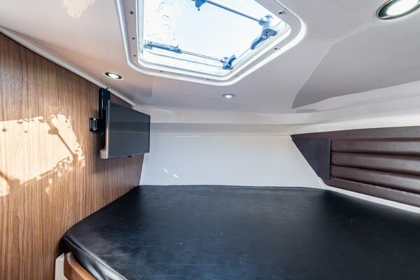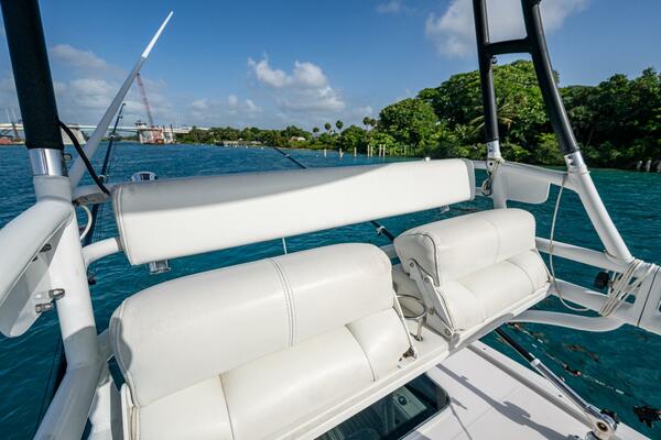 This center console, cabin boat has a full enclosure with A/C in the cockpit and separate A/C in the cabin. Shore power and gas generator supply power cruising or dockside. Upgraded Razor LED Light Bar for maximum night visibility.