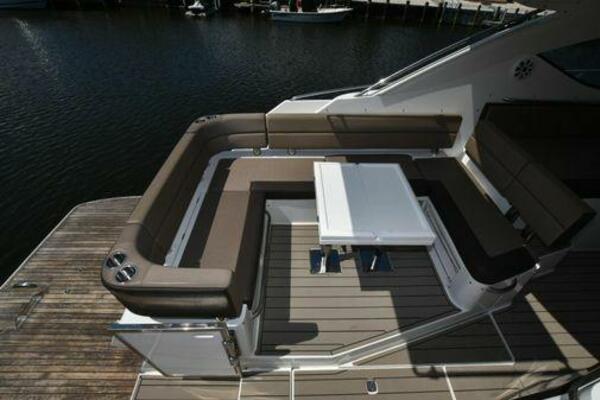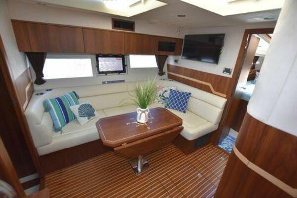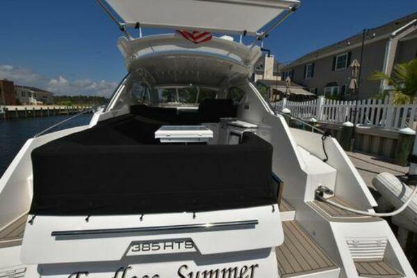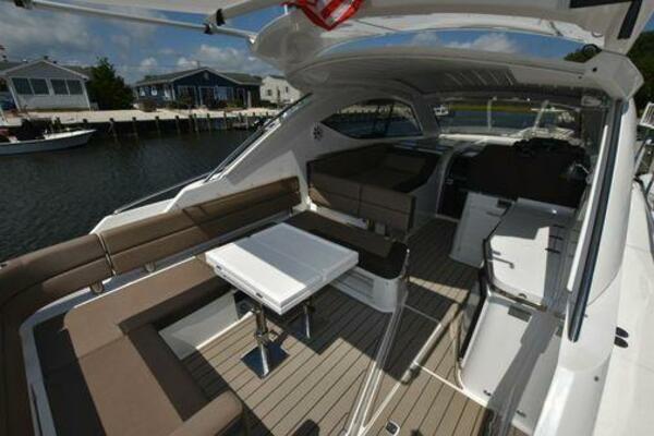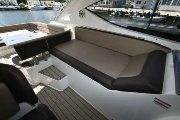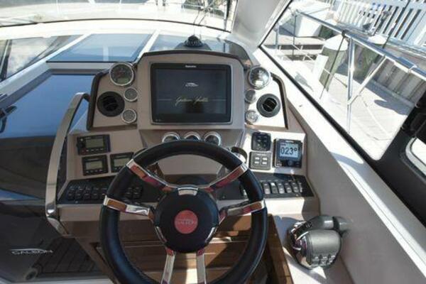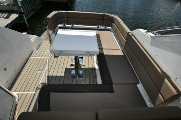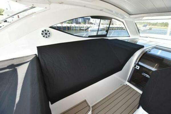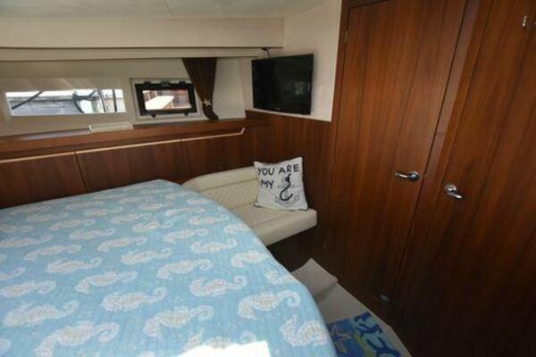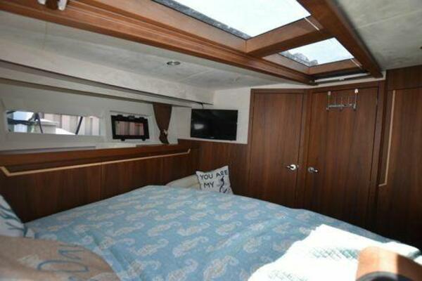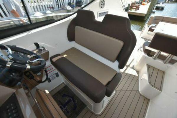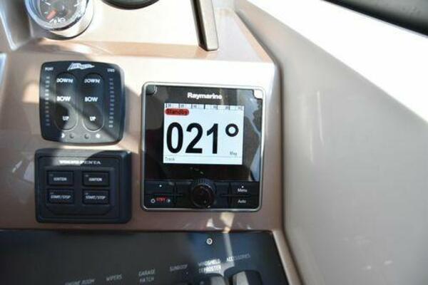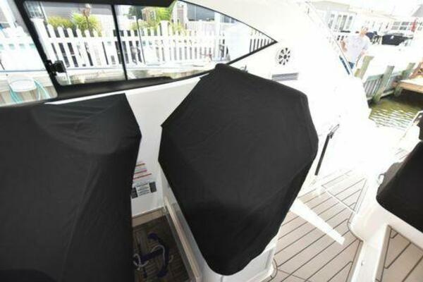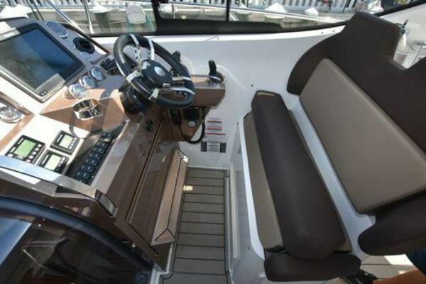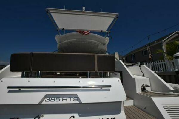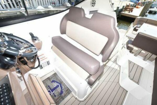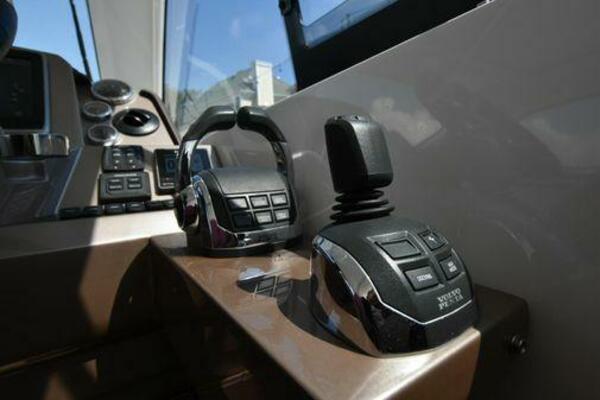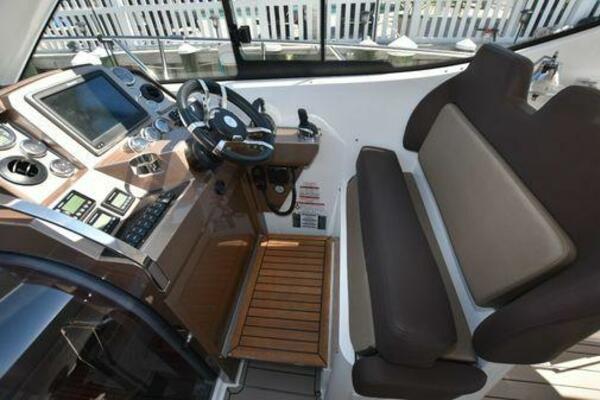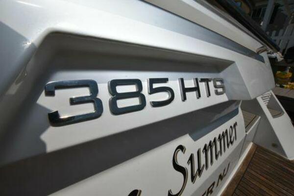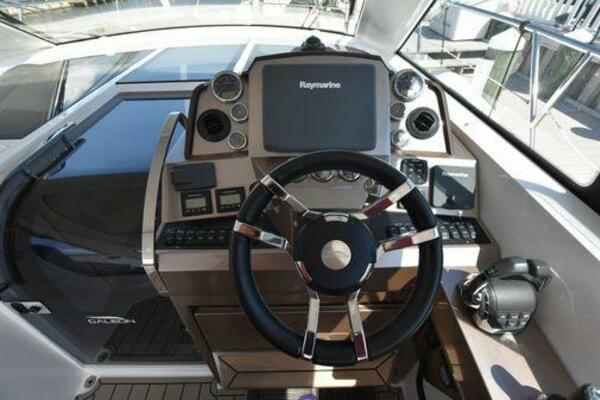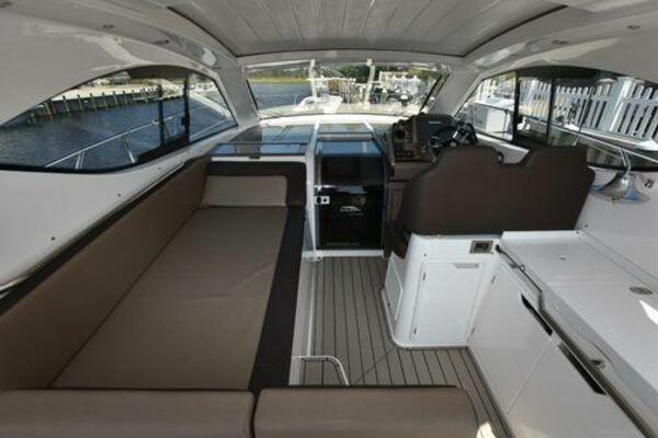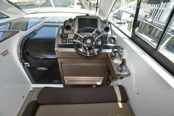 This boat has been meticulously Maintained. JOYSTICK CONTROL WITHOUT PODS!! Two heads and staterooms separated by solid wood doors. - Two Heads Sionix Night Vision $15,000 Sound system installed 2023 2 spare sets of Propellers New Raymarine Axiom MFD 2023 New batteries 2024 - A hydraulic dinghy garage at the stern of the boat, capable of holding a 9 foot dinghy - 6 foot teak swim platform - Teak and holly flooring in the cabin ( carpet covering included) - Diesel sterndrive power - Extremely efficient (26 GPH at 30 MPH cruise) tops out at 41 MPH This boat has amazing natural light. There are big windows around the cabin house, a huge sunroof that glides open quietly, an atrium effect in the lower salon from several skylights, and more skylights over the owner’s stateroom forward. Look at the details. Every drawer, locker and cabinet is fully lined with real walnut, some of it inlaid with maple. The stainless-steel rail welds and even the port lights (made in-house) are like fine jewelry. The layout of the master stateroom forward and the guest cabin aft under the cockpit isn’t unusual, but Galeon accomplished it with style (and full headroom). The master has a queen-size berth with a head en suite and a shower for the 3X sizes among us, and the aft cabin has twin berths that glide smoothly on tracks to become another queen for connubial couples. This also has its own head en suite with another 3X shower with a teak seat. Winter Canvas Cover for Cockpit High Quality Production Example of the 385/405 HTS Model Custom Single 50 Amp Shorepower with Reel Dinghy Garage has Hydraulic Hatch Lift
