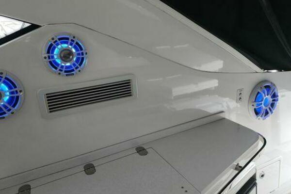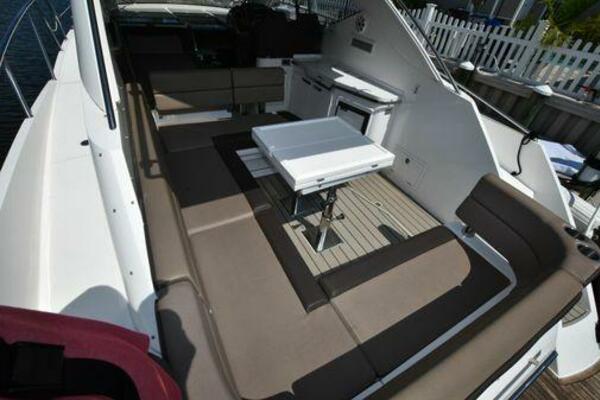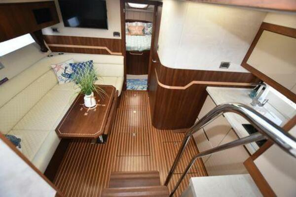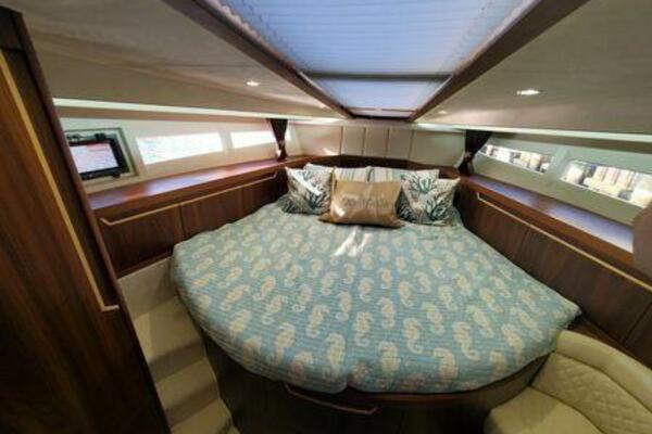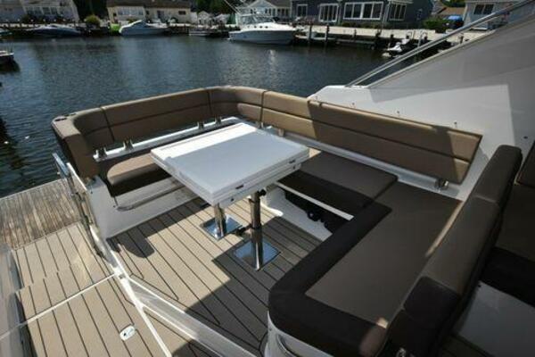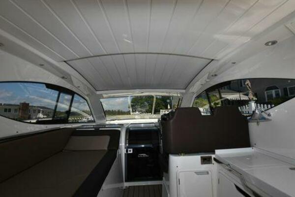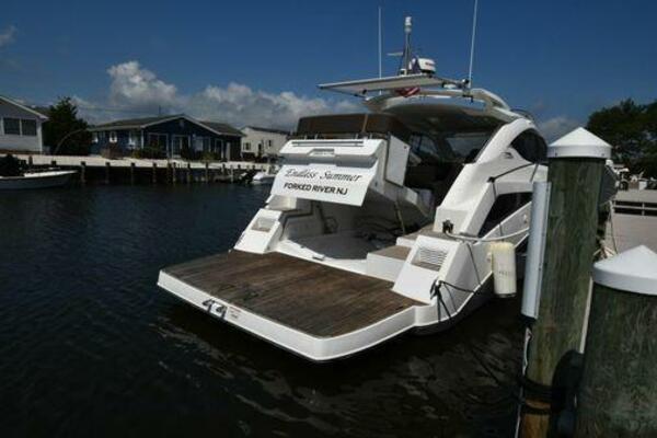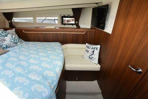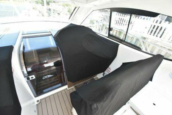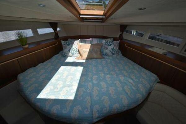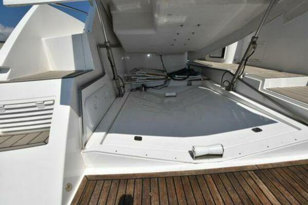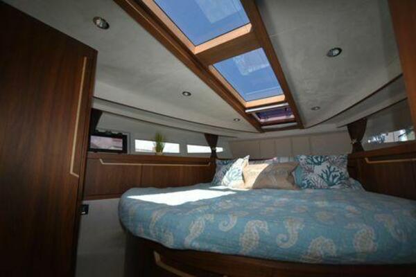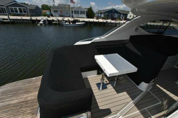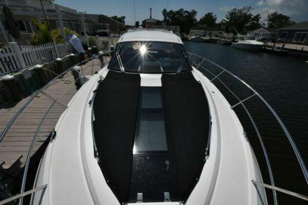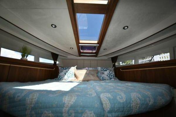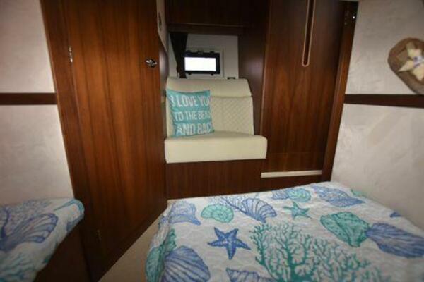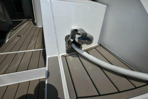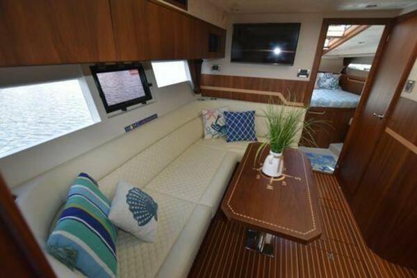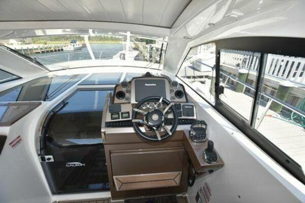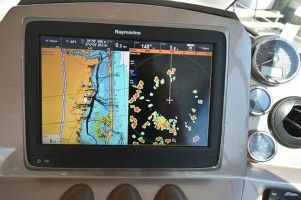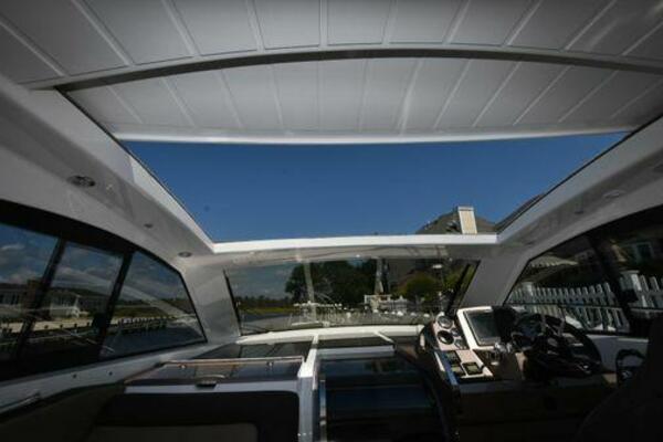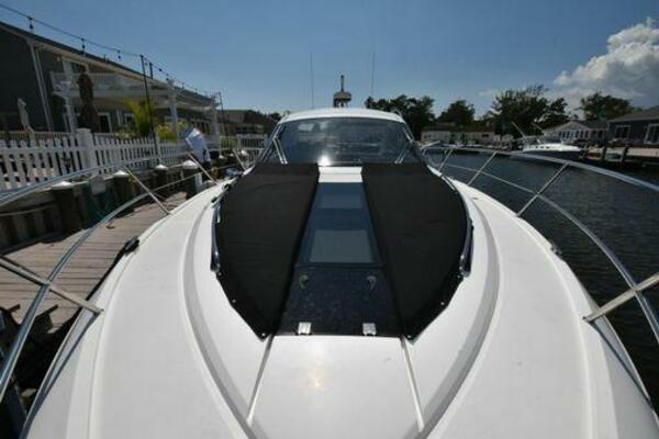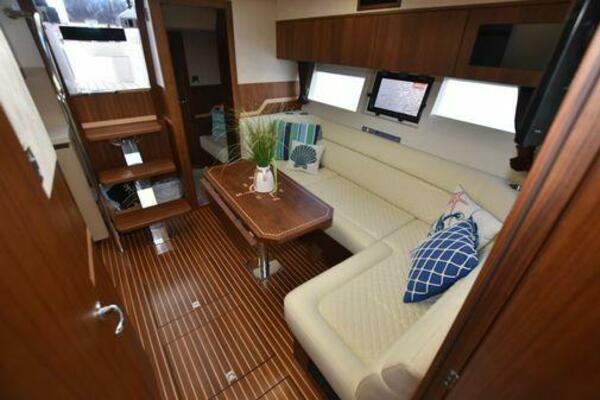 This boat has been meticulously Maintained. JOYSTICK CONTROL WITHOUT PODS!! Two heads and staterooms separated by solid wood doors. - Two Heads Sionix Night Vision $15,000 Sound system installed 2023 2 spare sets of Propellers New Raymarine Axiom MFD 2023 New batteries 2024 - A hydraulic dinghy garage at the stern of the boat, capable of holding a 9 foot dinghy - 6 foot teak swim platform - Teak and holly flooring in the cabin ( carpet covering included) - Diesel sterndrive power - Extremely efficient (26 GPH at 30 MPH cruise) tops out at 41 MPH This boat has amazing natural light. There are big windows around the cabin house, a huge sunroof that glides open quietly, an atrium effect in the lower salon from several skylights, and more skylights over the owner’s stateroom forward. Look at the details. Every drawer, locker and cabinet is fully lined with real walnut, some of it inlaid with maple. The stainless-steel rail welds and even the port lights (made in-house) are like fine jewelry. The layout of the master stateroom forward and the guest cabin aft under the cockpit isn’t unusual, but Galeon accomplished it with style (and full headroom). The master has a queen-size berth with a head en suite and a shower for the 3X sizes among us, and the aft cabin has twin berths that glide smoothly on tracks to become another queen for connubial couples. This also has its own head en suite with another 3X shower with a teak seat. Winter Canvas Cover for Cockpit High Quality Production Example of the 385/405 HTS Model Custom Single 50 Amp Shorepower with Reel Dinghy Garage has Hydraulic Hatch Lift
