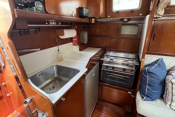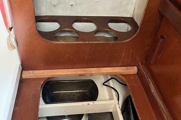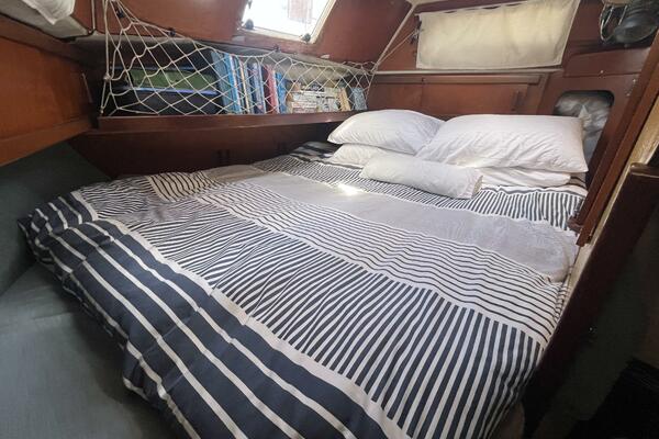 - Full length settee, starboard, coverts to pilot birth with fold over lee-bord