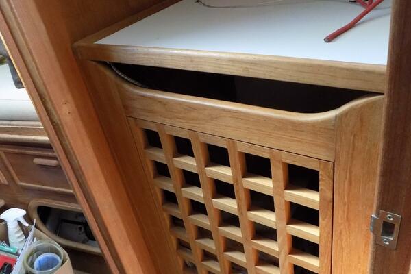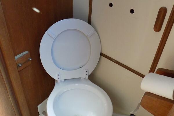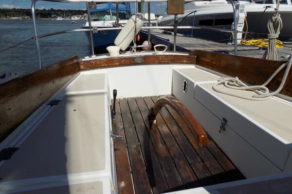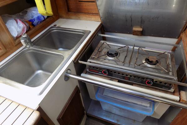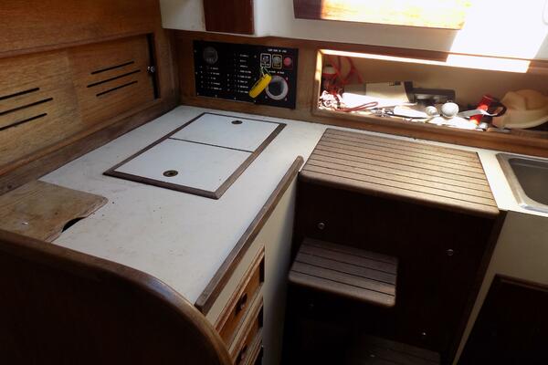 A traditional interior, with an ergonomic layout optimized for a couple or a small family. A V-berth forward, abaft to port which is an enclosed electric head. To starboard is a custom sail storage locker. The main saloon has settees port and starboard, and a drop down table. Ample storage for extended cruising. Shelves outboard, cubbies port and starboard The compact galley to port is equipped with stainless steel sink and an Origo 3000 alcohol 2 burner stove. An ice box is to starboard, Ambient light and ventilation is enabled by opening ports and hatches, Off white upholstery in good condition. Teak sole.