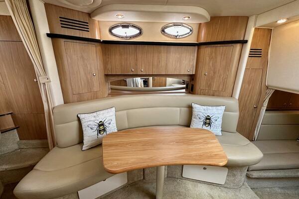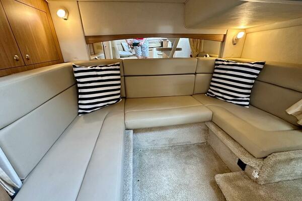- Seating - U-shaped cockpit seating with white marine-grade upholstery, two seats facing forward and a loveseat to port by the helm.