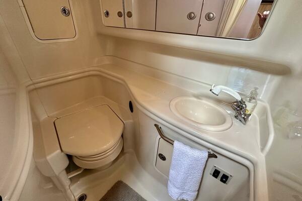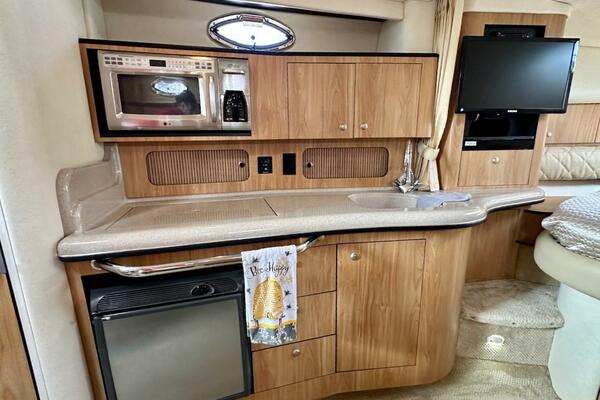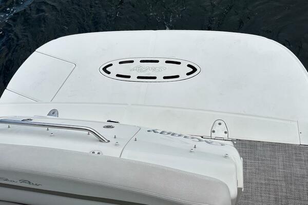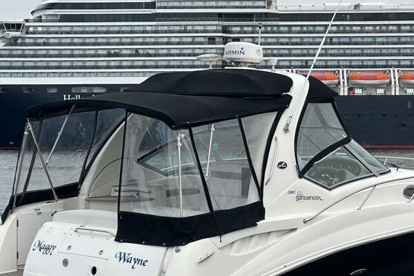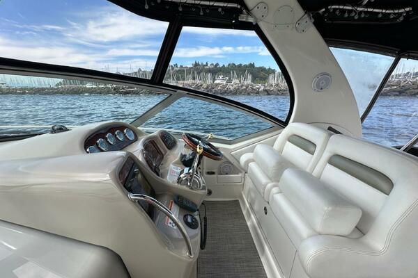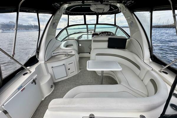 The cockpit area is full of nice features, including a full camperback enclosure aft, with upgraded izenglass and hard clear panels forward, upgraded JL speakers, a Samsung TV, upgraded Garmin electronics (including radar) at the helm, an icemaker, and Infinity padded outdoor flooring. She's ready for entertaining or weekends away.