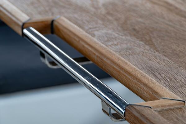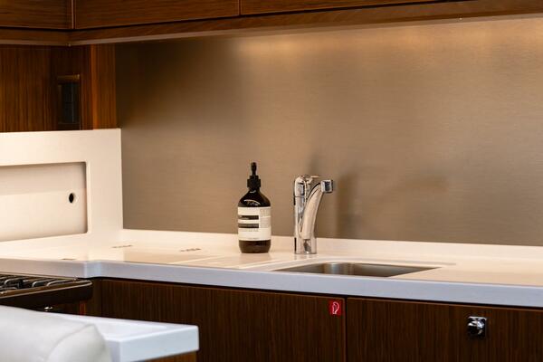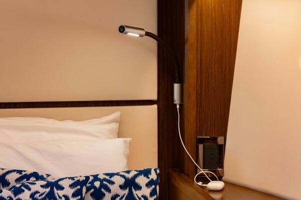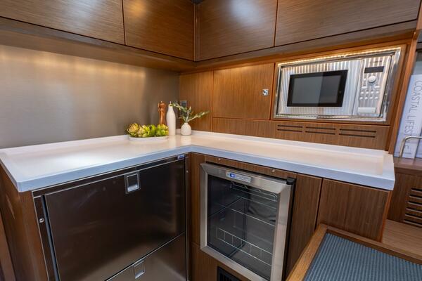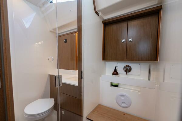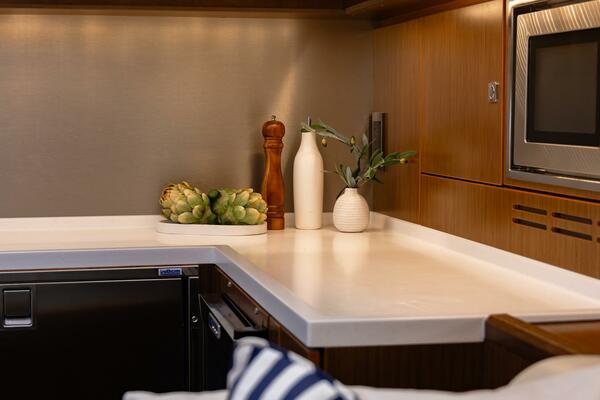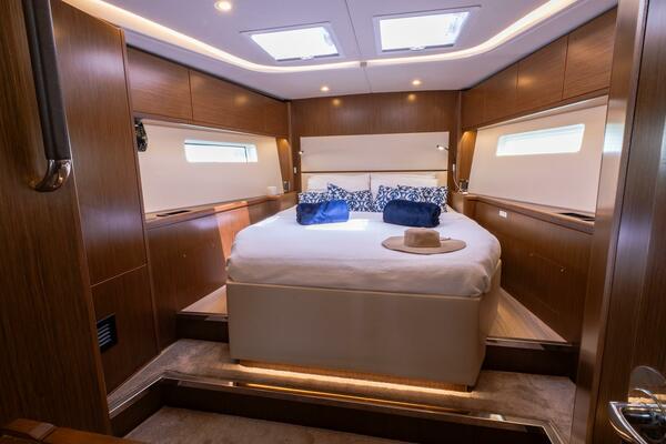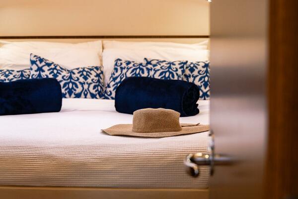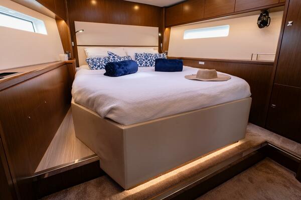 Below deck, Nixie features an open-plan saloon with abundant natural light and ceiling heights up to 2.4 metres. The full-beam galley sits just forward of midships, providing ample bench space and storage. The owners’ suite is spacious with a walk-around queen bed, plentiful light and a separate ensuite shower and head.