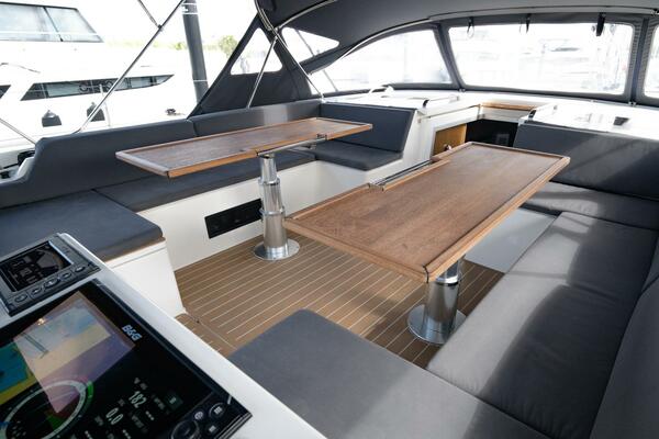 Aft of the galley, the dining area includes an electrically adjustable table that transforms from dining height to a coffee table, complemented by a 42-inch smart TV opposite a two-person starboard sofa. The navigation station and chart table are located just aft with comprehensive B&G instrumentation.