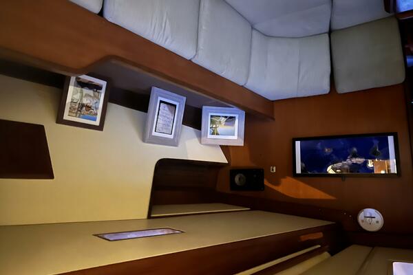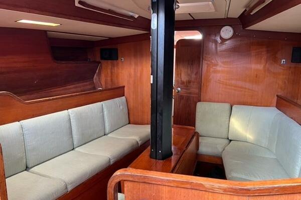 The interior is a single level open plan arrangement with midships saloon, midships port side galley, aft nav station and port and stbd seating on either side of a central table arrangement, the accommodation arrangement consists of a fwd v-berth and with aft double bunk cabin with port side heads arrangement.