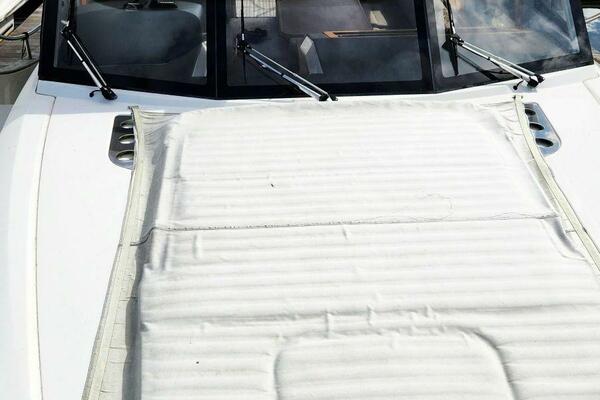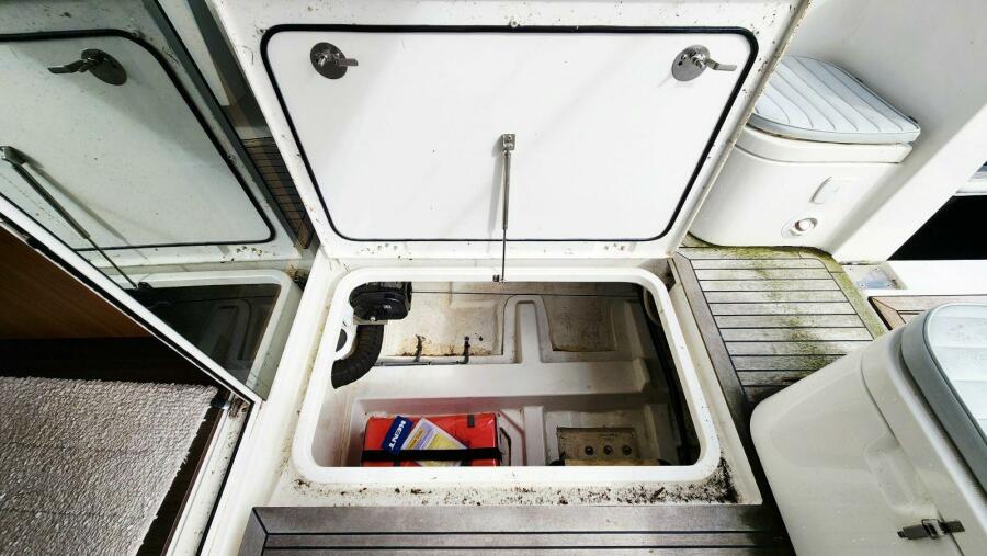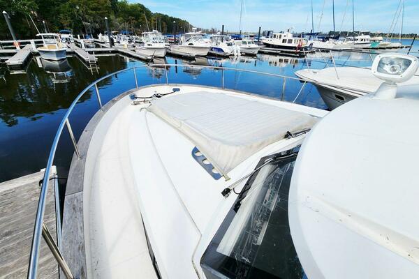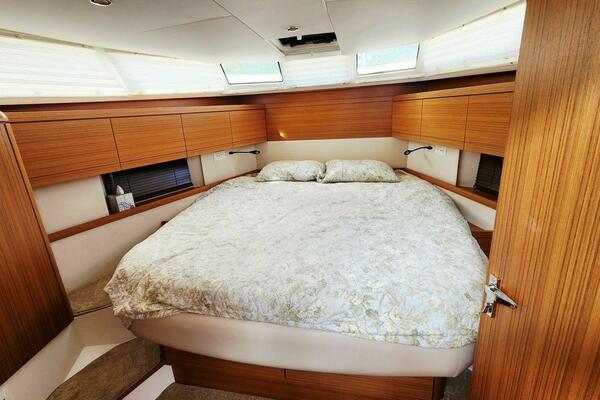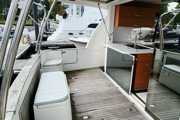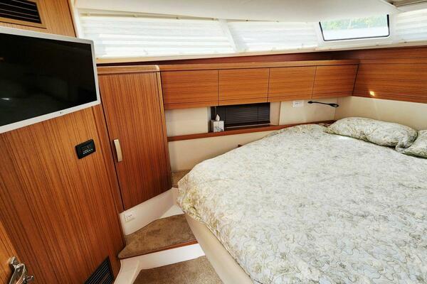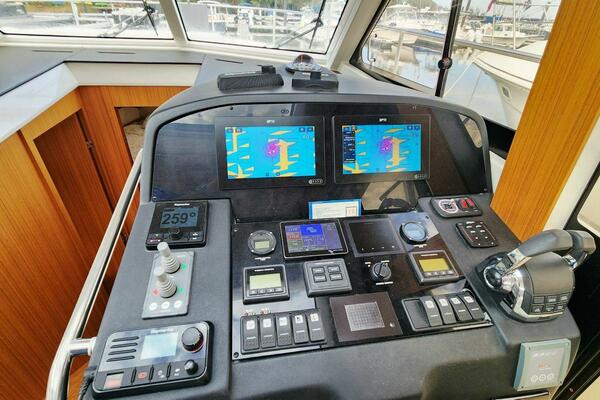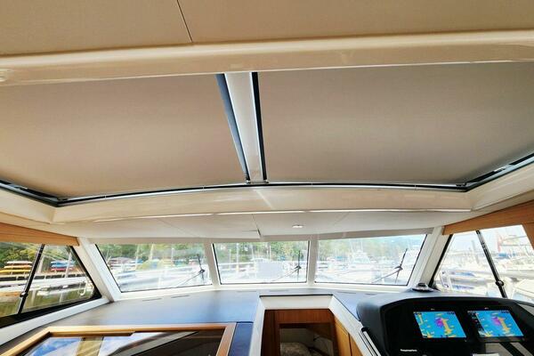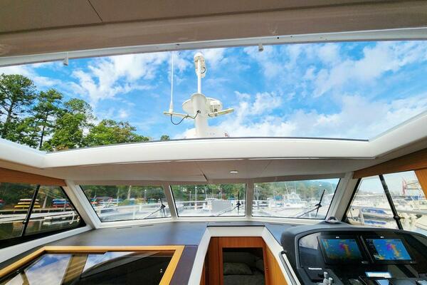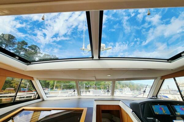 To starboard, additional cabinetry conceals a pop-up TV as you move toward the helm. The helm station is equipped with a double seat, side deck access door, and a suite of modern navigation electronics. Excellent sightlines are enhanced by a large opening sunroof overhead, bringing fresh air and natural light to the helm.