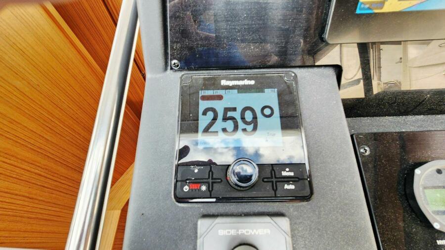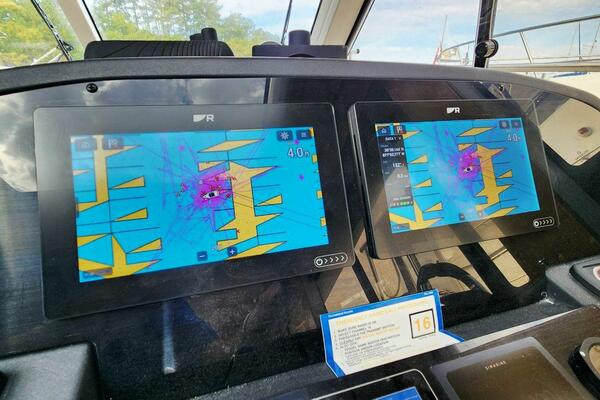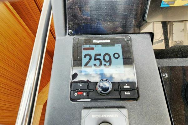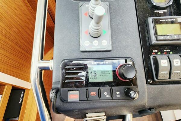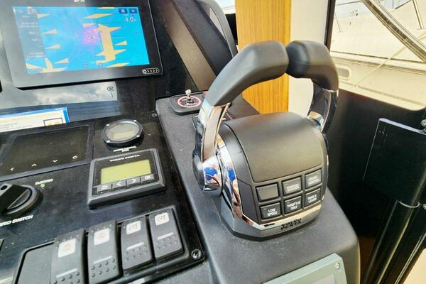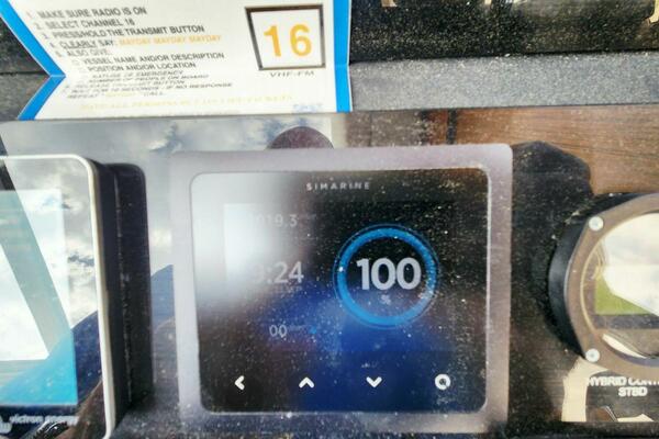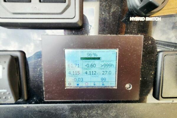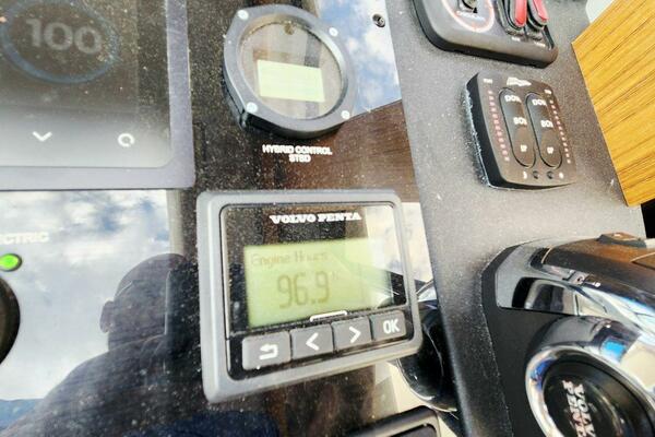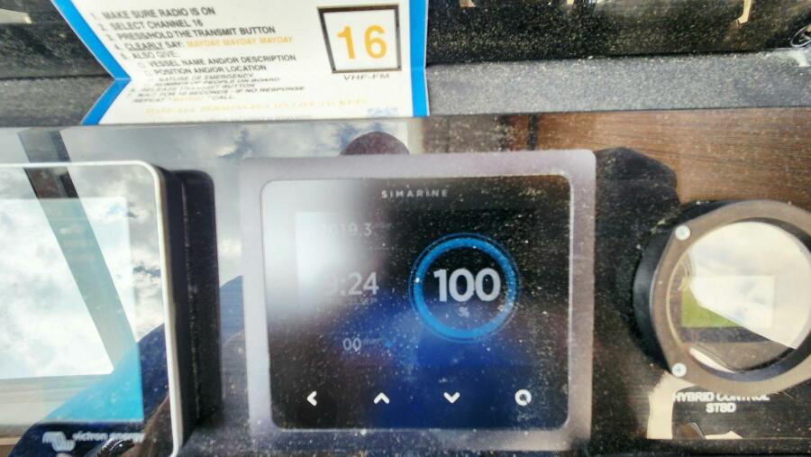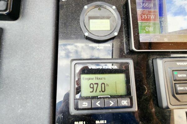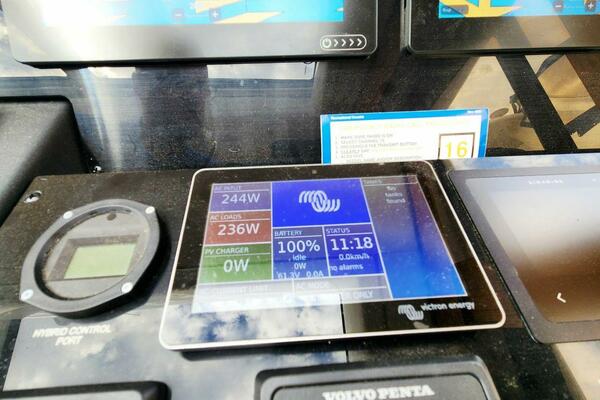 A Victron energy management display is also integrated at the helm, giving real-time oversight of batteries, charging, and power usage—so you know exactly how the hybrid system and solar array are performing at a glance.