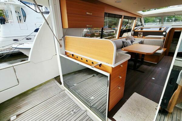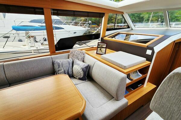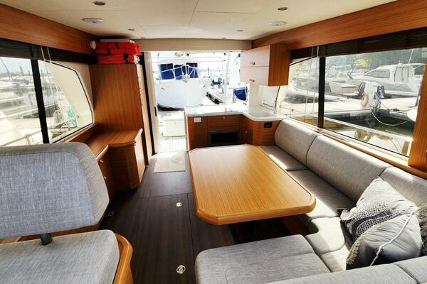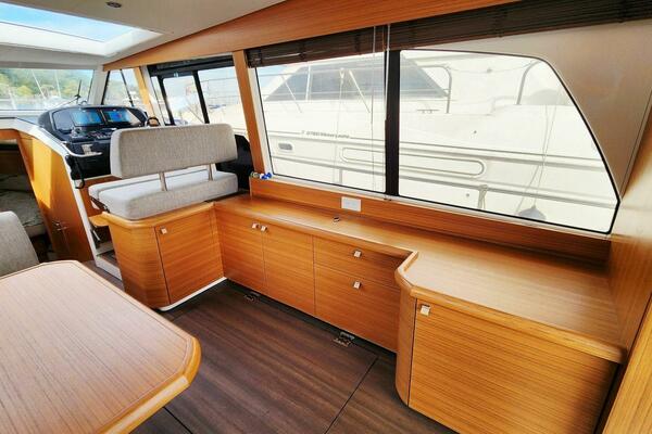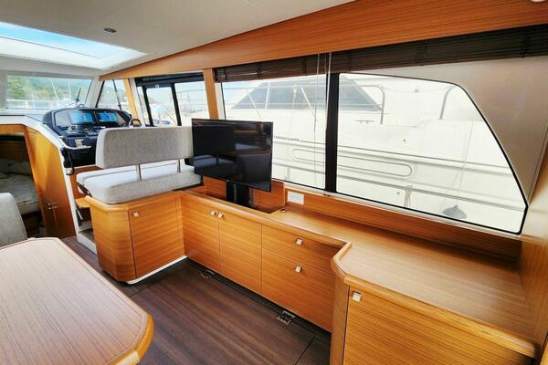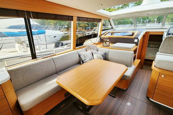 Step inside through the sliding aft door, and the interior immediately impresses with its bright, airy feel. Expansive windows flood the salon with natural light, while a mix of golden teak finishes, dark-toned flooring, and Rugana upholstery strike a perfect balance of warmth and modern style.