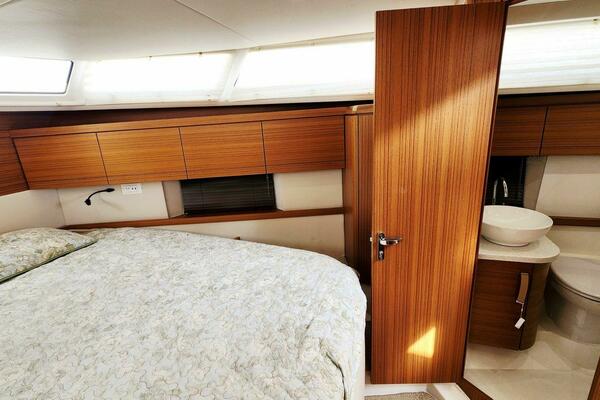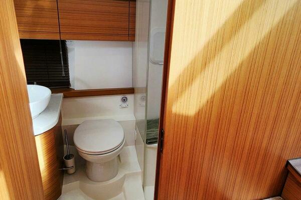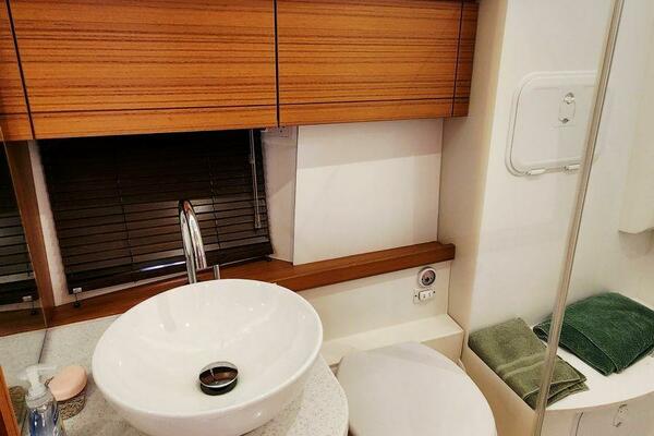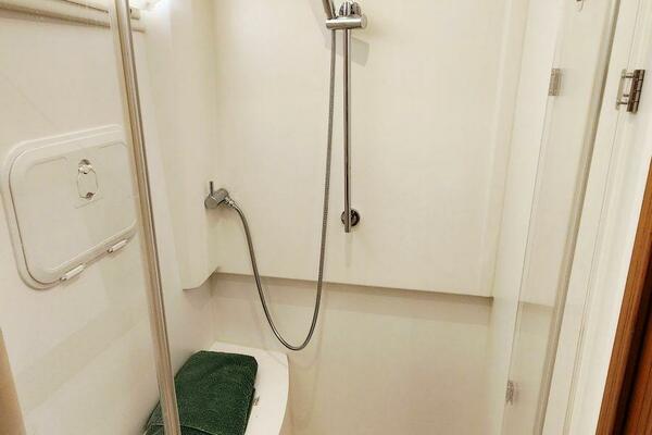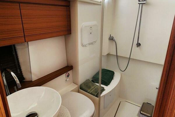 A couple of steps down reveal the accommodations. The guest cabin offers either twin singles or a full double, with lockers and opening ports. The head is arranged with an electric toilet, vanity, and separate shower, accessible from both the companionway and the owner’s cabin. The master stateroom provides flexibility with a berth that can be arranged as a V-berth or an island queen, along with ample storage and natural light from overhead and side ports.