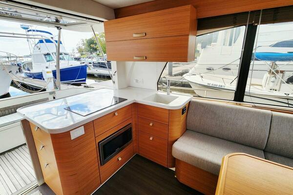 The galley is thoughtfully placed to port and fitted with Kerrock countertops, an induction cooktop, built-in microwave, and abundant cabinetry. Opposite sits a full-size refrigerator/freezer. One of the boat’s standout features is the wide aft window that flips open with a folding counter, creating an effortless pass-through to the cockpit—perfect for entertaining. Ahead, the convertible dinette easily transitions from dining table to coffee table, or even drops down for an extra berth.