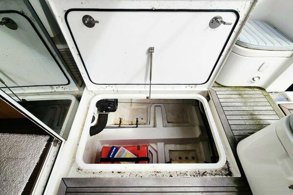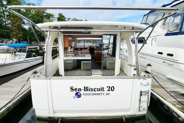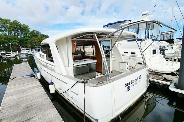 Boarding Sea-Biscuit 20 is simple and inviting, thanks to dual side gates that lead you onto a teak-clad aft deck. Here, you’ll find safe passage to the side decks, twin deck hatches that reveal a roomy lazarette, and a clever fold-down transom that extends the deck into a swim platform—ideal for lounging or water access.