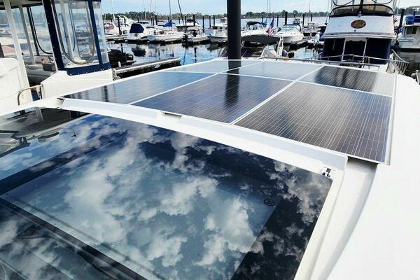 At its core are six high-output photovoltaic solar panels providing up to 1.8 kWp of charging power, managed through an advanced solar battery charge management system. This system continuously feeds the house bank—an impressive 600Ah service battery bank paired with a 12V/3000VA/120A automatic inverter/charger—to ensure you always have reliable, silent power on demand. The result is a permanent 110V system throughout the boat, meaning household-style power is available at all times without the constant hum of a generator.