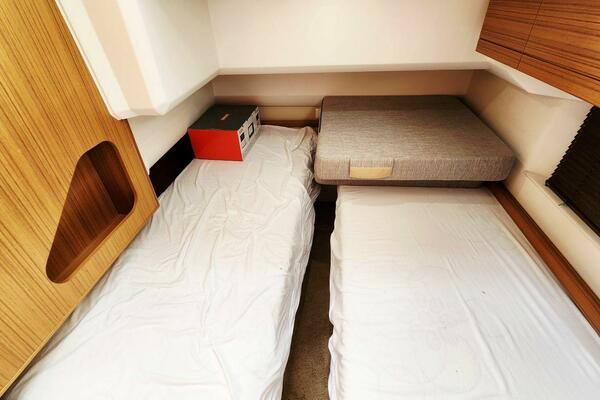 Below, the accommodations are designed for flexibility. The guest cabin to port features twin berths that can combine into a double, along with locker storage and opening ports. The head is smartly appointed with an electric toilet, vanity, and a separate shower, with dual access from both the companionway and the master stateroom. In the master, the berth converts from a V-berth to a full island queen, surrounded by ample storage and bathed in natural light from windows, ports, and hatches.