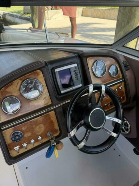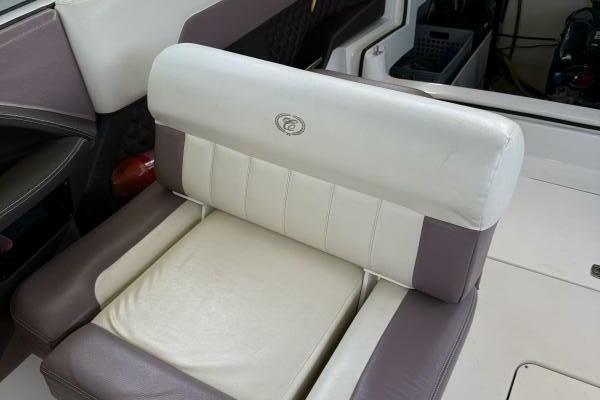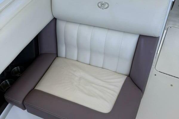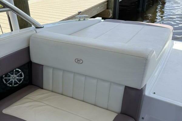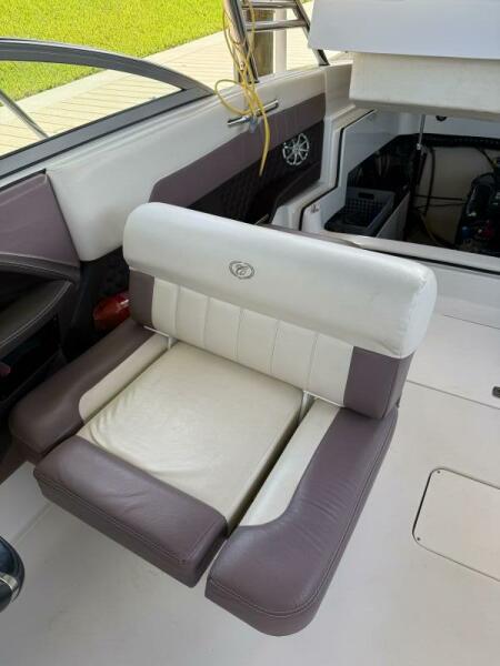 This Cobalt 296 has been exceptionally well maintained and benefits from being kept on a covered lift, protecting her from the sun and waterline staining. The upholstery, canvas, and exterior finishes present in excellent condition, reflecting the care she has received.