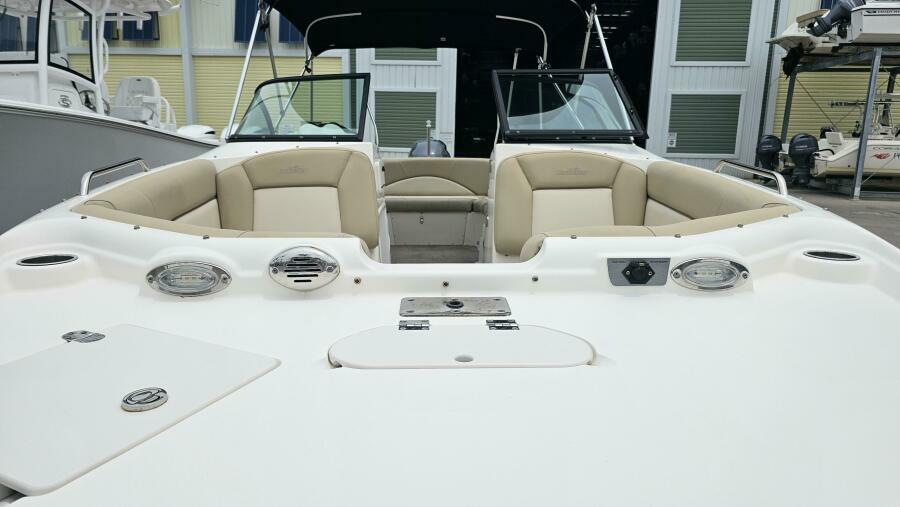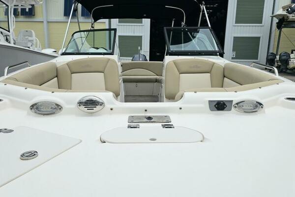 Its rugged Deep-Vee hull and U-shaped wraparound cockpit ensure a comfortable ride for everyone. A panoramic walk-through windshield, enclosed dressing room, leather touch upholstery and Fusion® stereo system are just a few of its creature comforts. A Seadek transom landing and forward and aft boarding ladders extend the fun beyond the boat. Take it up a notch with the optional fishing package, which includes a live bait well and fishing seat. Now we are talking.
