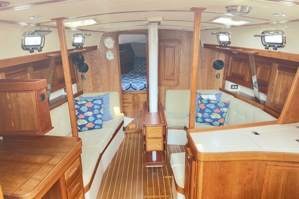 - Main salon with drop-leaf centerline table and convertible settee berth