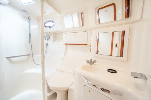 The Sea Ray 450 Sundancer "Knot EZ II" is a well maintained and mechanically sound vessel with all the amenities a family might need for coastal cruising, overnight trips, or just a day at the sandbar. The cockpit provides wonderful space for relaxing, with a spacious circular aft-facing seat, U-shaped seating, and Euro cockpit tables that convert to a sunpad. The aft sunpad turns into a useful chart table. If water toys are a part of the game plan, the 450 Sundancer has plenty of room for storing them. The oversize integral TNT swim platform is large enough to hold a personal watercraft and is remote actuated for convenience, while the aft wall fender storage neatly organizes docking equipment. The standard Lofrans Progress I rope - chain windlass makes anchoring easy. Four lockable translucent deck hatches with screen covers, sliding windows and ten opening port lights provide natural light and fresh air throughout the cabin on mild days. The vessel is outfitted with central heating and recently serviced air conditioning. In the salon, a sleeper sofa, hi-lo dining table, and entertainment center provide comfort and cool air away from topsides exposure. Amidships, the Sundancer berth functions as a conversation area by day and, by night, sleeping quarters for two in the double berth. There's also a cedar-lined hanging locker, vanity with drawers, and space for a TV - VCR - radio. The midships guest head has a VacuFlush toilet, vanity with sink, and fiberglass shower stall with curtain. The private master stateroom has a full-size bed with storage underneath, three cedar-lined hanging lockers with mirrored doors, vanity, pocket privacy door, and a flat screen television. The master head features a VacuFlush toilet, vanity with sink and mirrored medicine cabinet, and fiberglass shower stall with circular acrylic door. It's accessible from the salon or master stateroom. Faux-granite countertops highlight the full galley, with refrigerator - freezer, three-burner electric stove, and microwave. The galley includes ample cabinet space, a coffeemaker and blender.