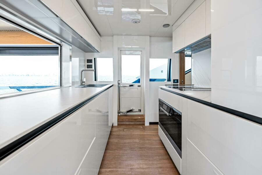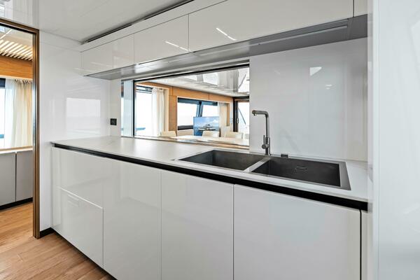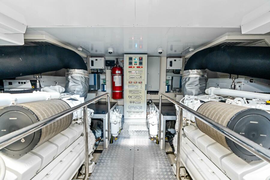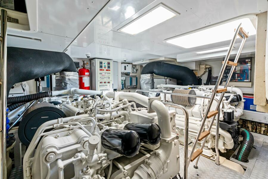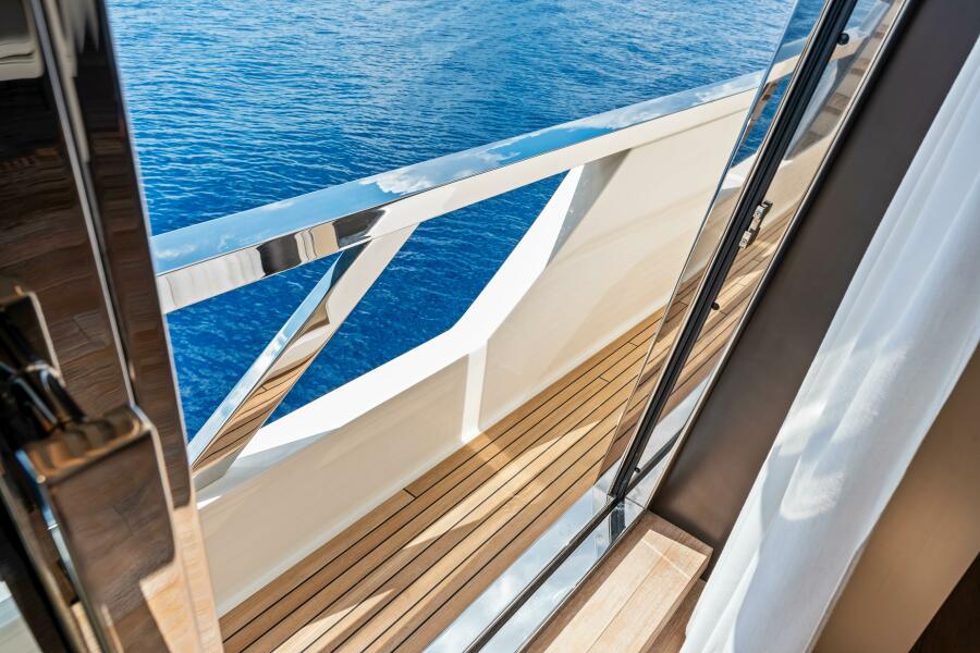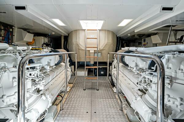 The yacht is available with MTU engines, providing speeds up to 26 knots.