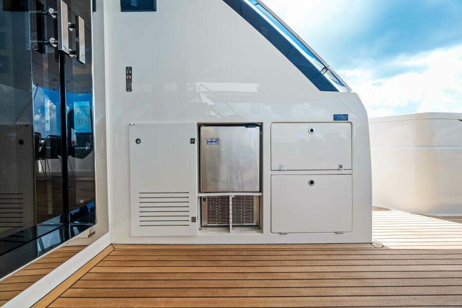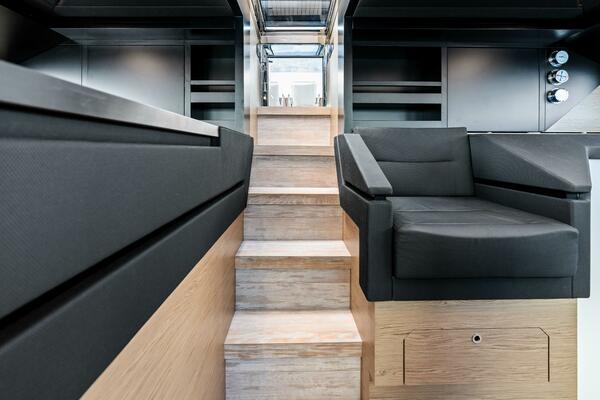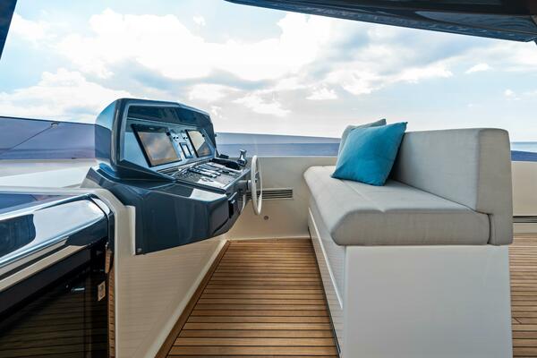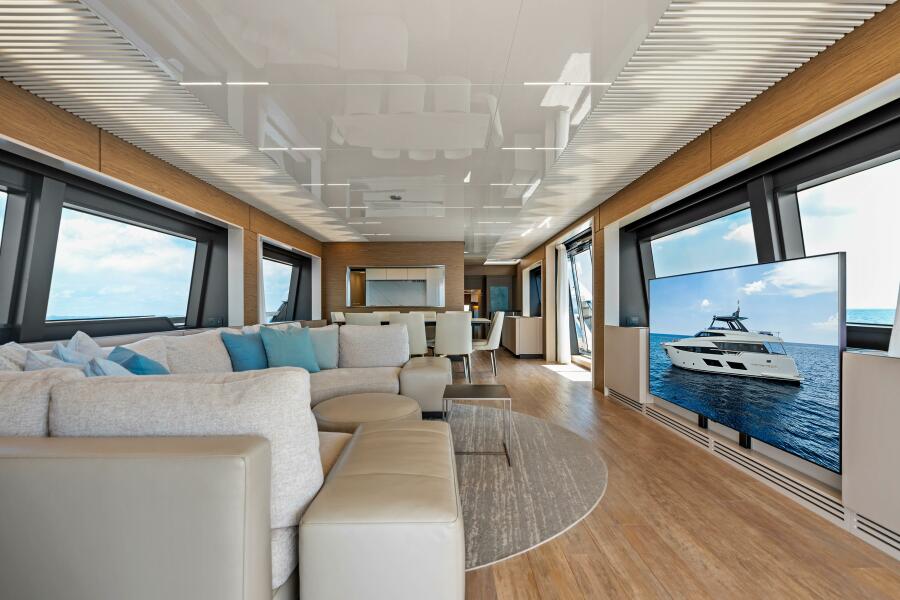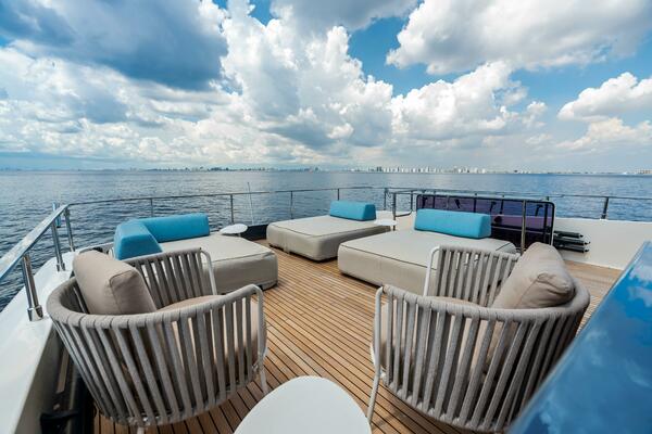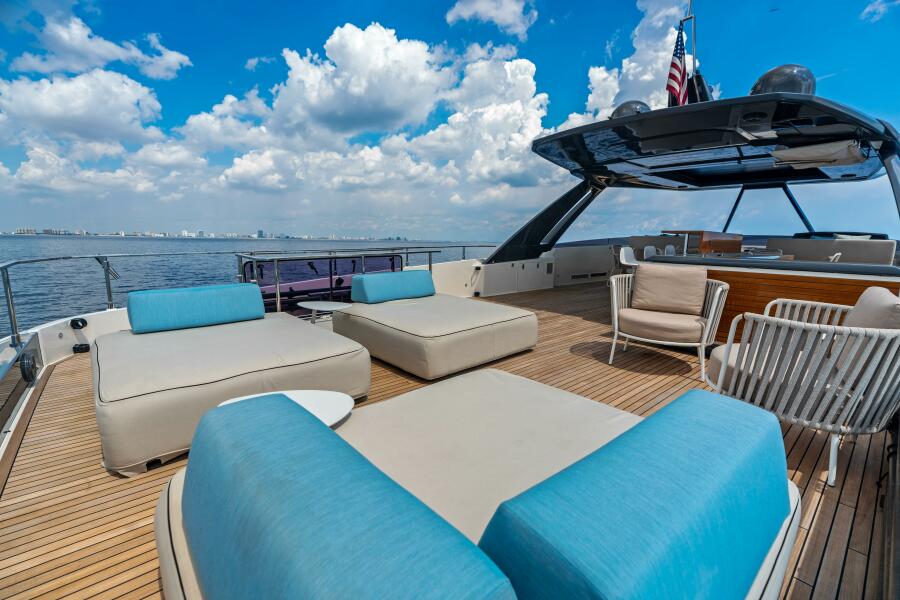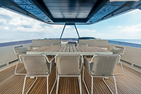 The flybridge offers a panoramic deck with ample space for relaxation and socializing, including a dining area, sunbeds, and a bar.