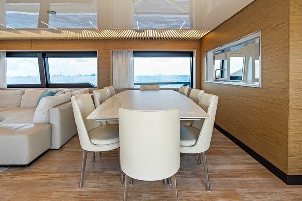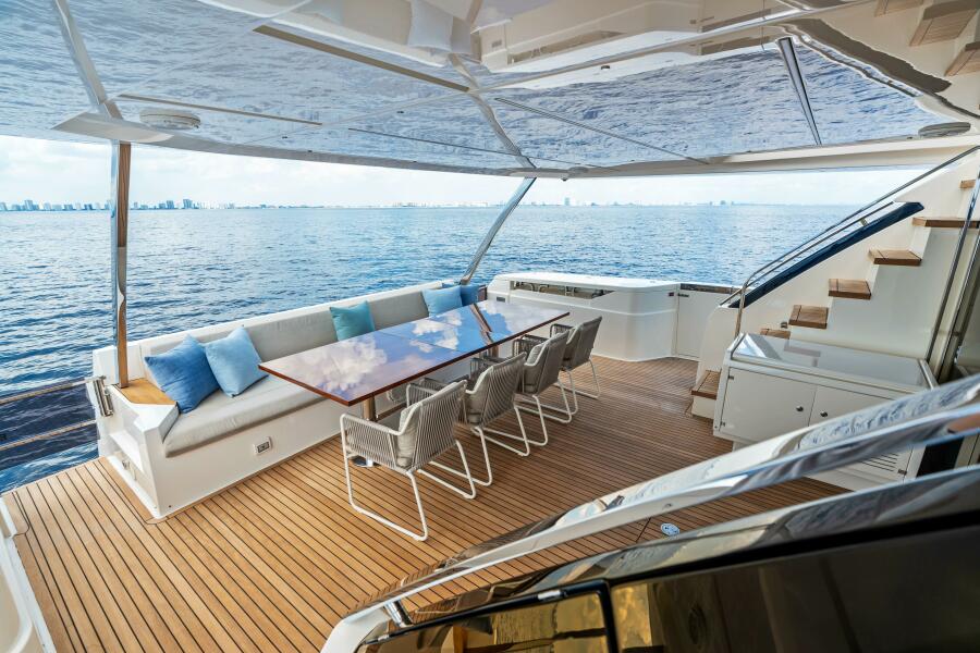 The aft cockpit features a spacious dining area and a submersible hatch leading to a beach club and tender garage.