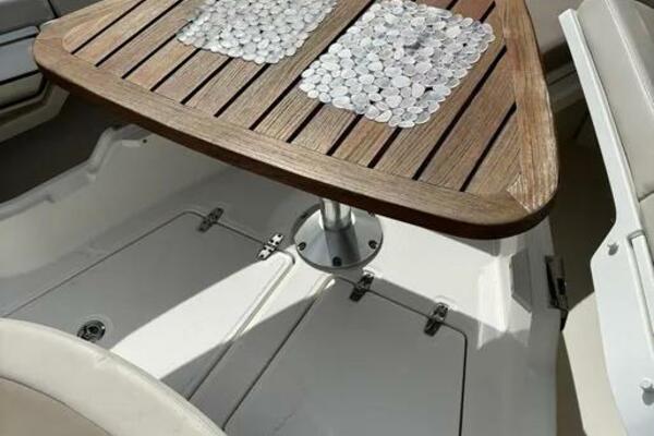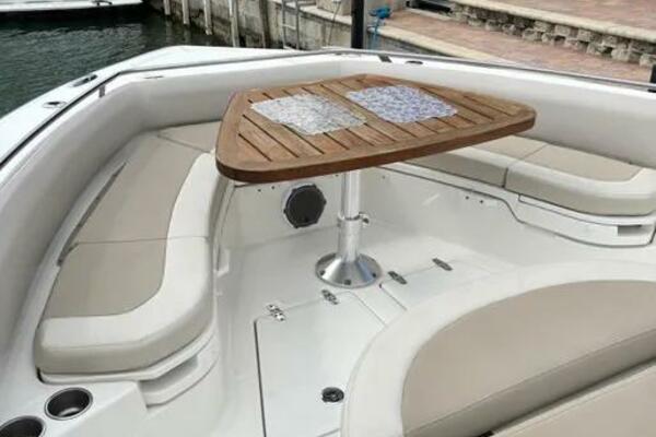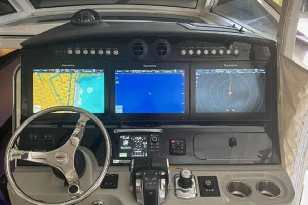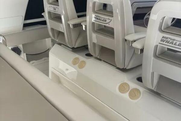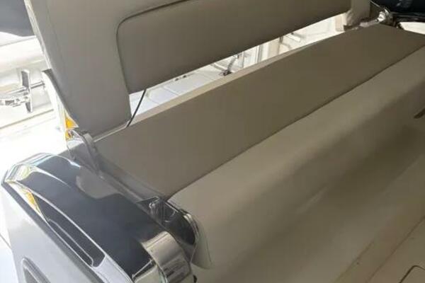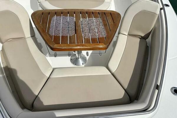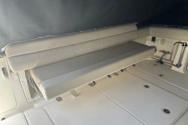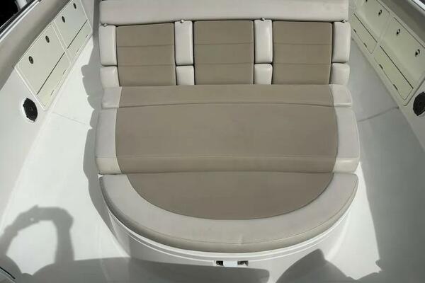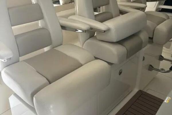 - Helm and companion bolster style seats (3) with fold-down armrests (center seat is electrically actuated) (port and starboard seats rotate to face aft)