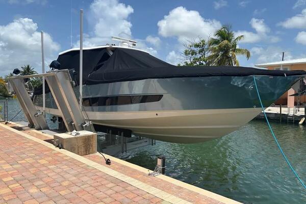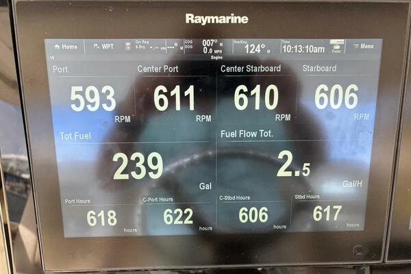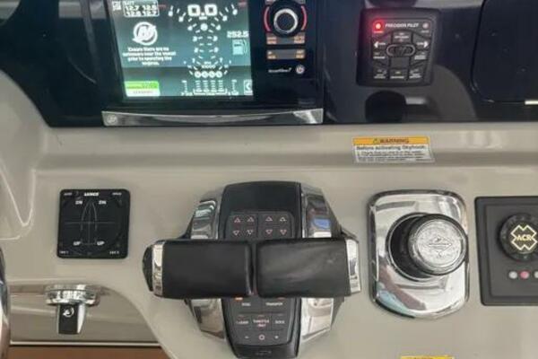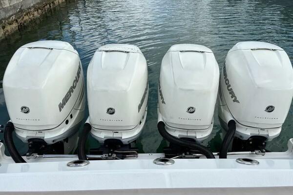 Quad Mercury Verado 350s unleash a total of 1,400 horsepower, providing effortless speed and smooth efficiency, while the joystick piloting system ensures ultimate control for docking and cruising.