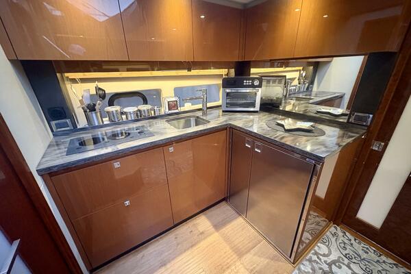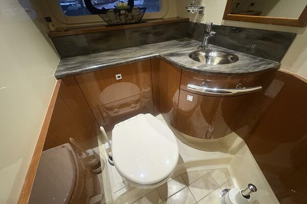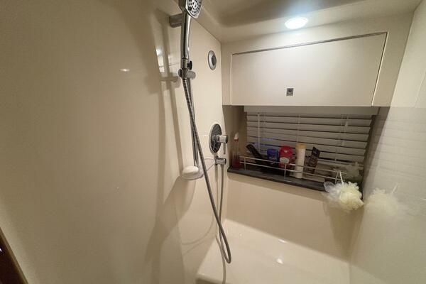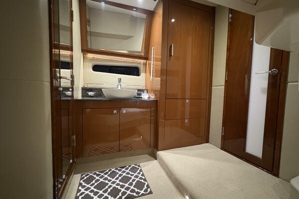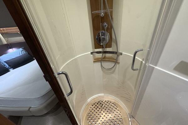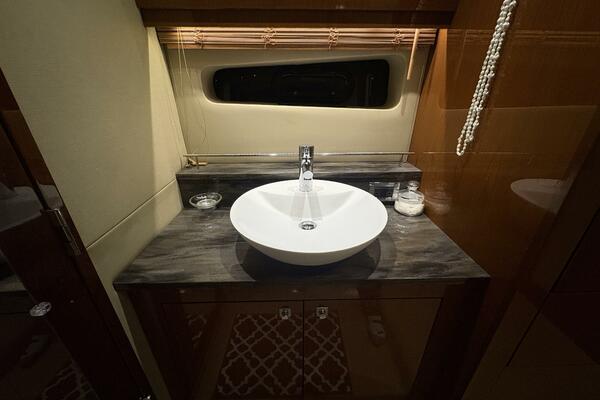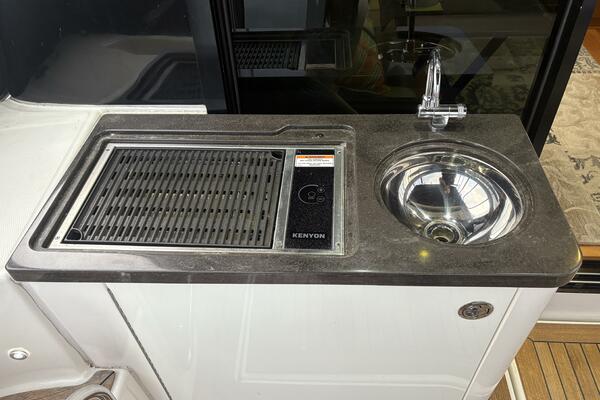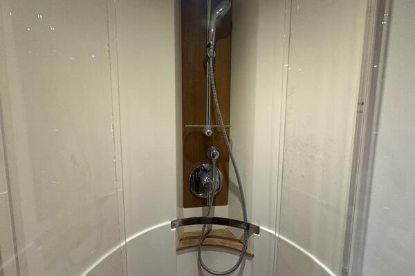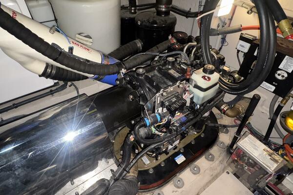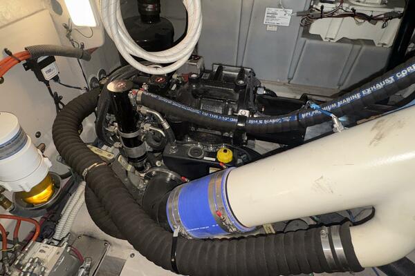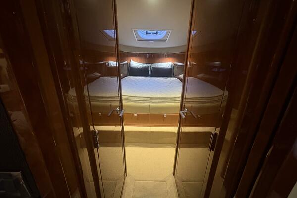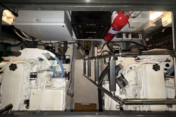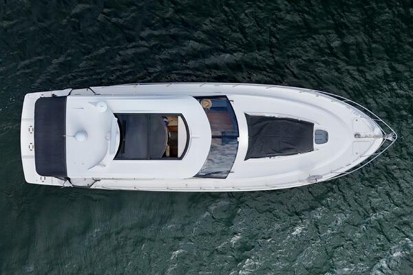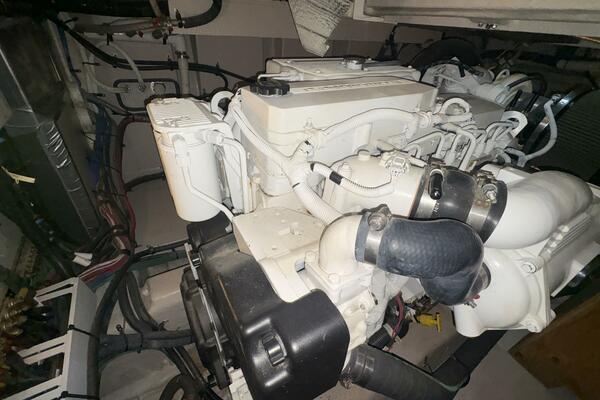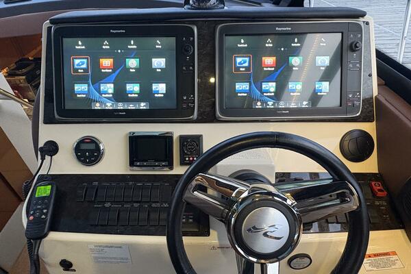 This freshwater, low-hour, one-owner example is powered by upgraded twin Cummins QSB 6.7 Zeus Pod Drives, each delivering 480 HP. She is equipped with many desirable options such as: joystick maneuvering, Sky Hook, Dock Mate controller, hydraulic swim platform, cockpit icemaker, refrigerator and grill, and a custom installed cockpit enclosure (factory retractable sunshade still installed).