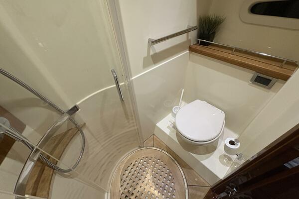 The glass coupe doors open into the upper salon featuring a fold away TV, fridge, massive electric sunroof with sunshade, teak flooring, LED mood lighting, and seating for 10. The interior accommodates two well-appointed cabins and two heads, including a full-beam aft master with en-suite and a forward VIP berth with private head. The 470 truly offers a spacious social floorplan, making it ideal for families or couples seeking luxury cruising.