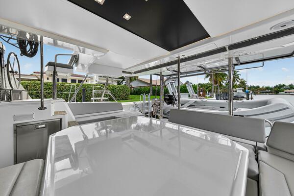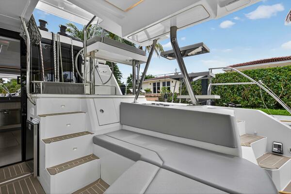 This lounge feature first launched on the award-winning Leopard 50 and like her big sister, the lounge on the Leopard 45 includes a seating area, a sunbed, and a table. Access to the lounge is provided by floating stairs leading up from the aft cockpit, without disrupting the helm station. The helm station remains well protected, and integrated into the cockpit and the rest of the boat.