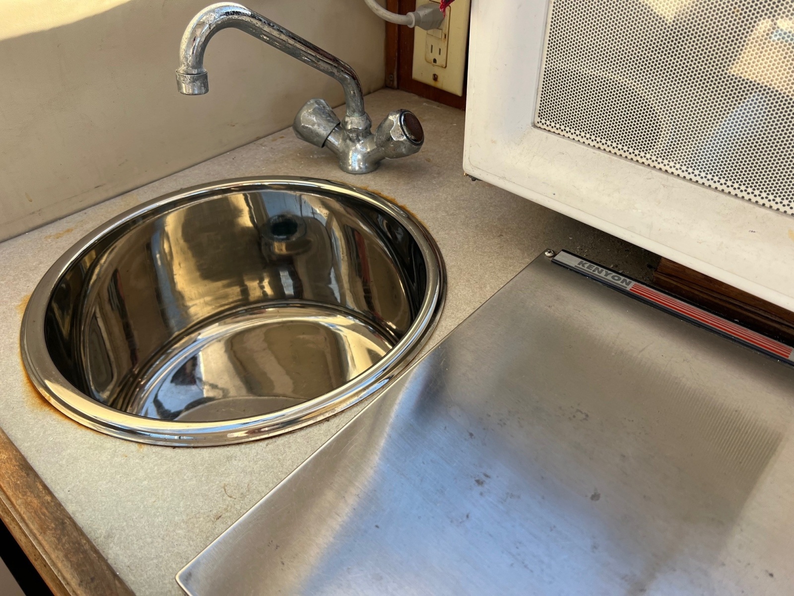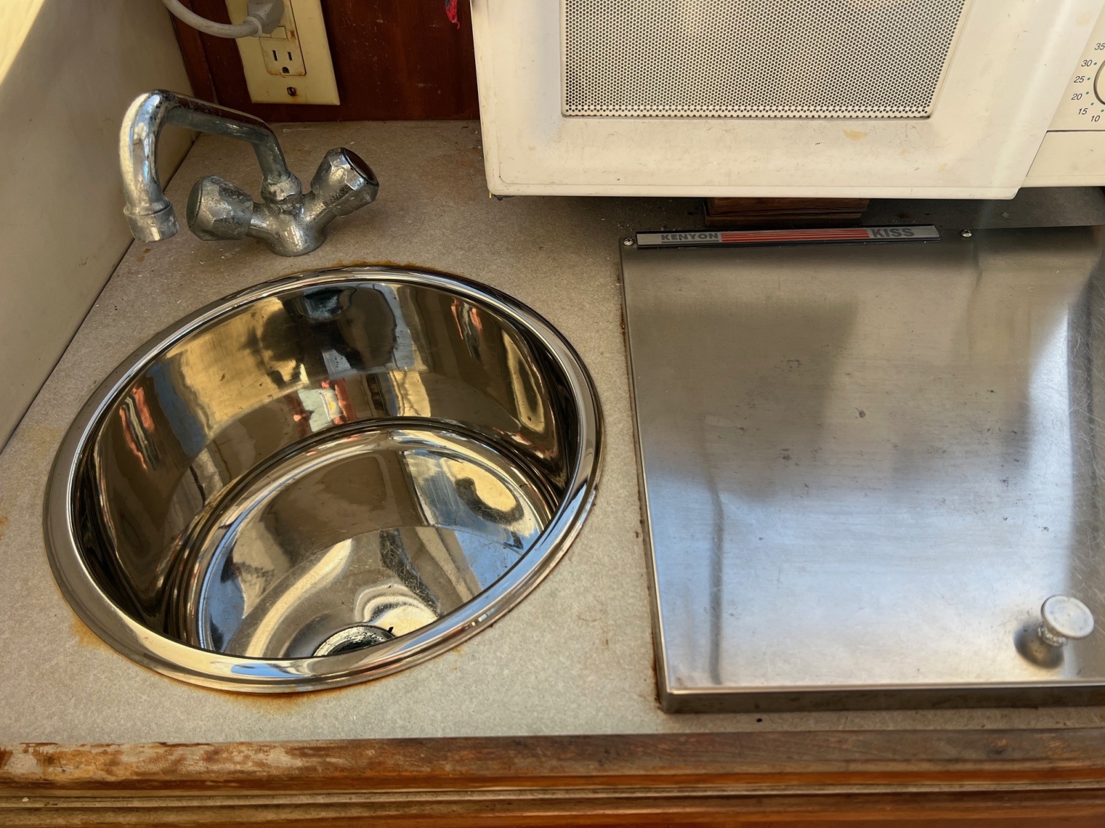 - Galley: A small galley area with stove, microwave, refrigerator (new in 2023), fresh water sink; dinette with removable table.